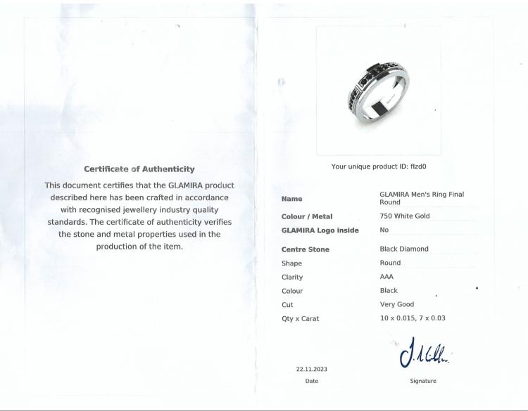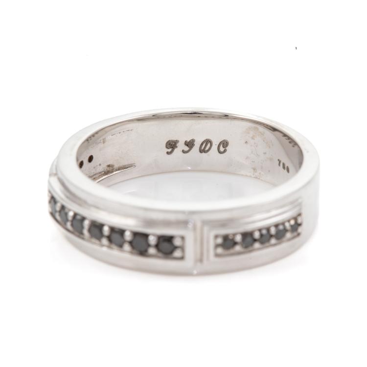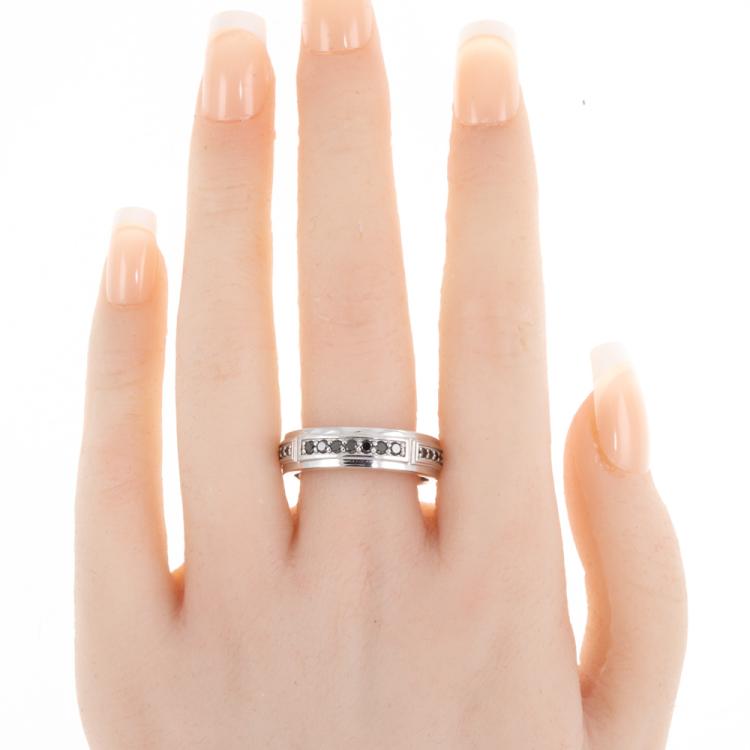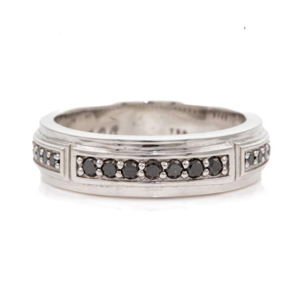 Diamond mens ring with round black Diamonds totalling 0.36cts (Note - Black Diamond maybe treated). 18ct white gold. Ring size U - ring resizing is not recommended. Band width: 6.2mm. Weight: 9.5g. With copy of Certificate of Authenticity. With engraving: JGDC. (Pre-owned)
