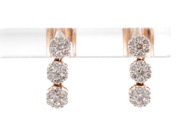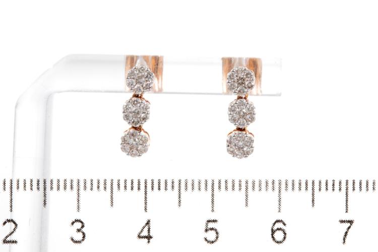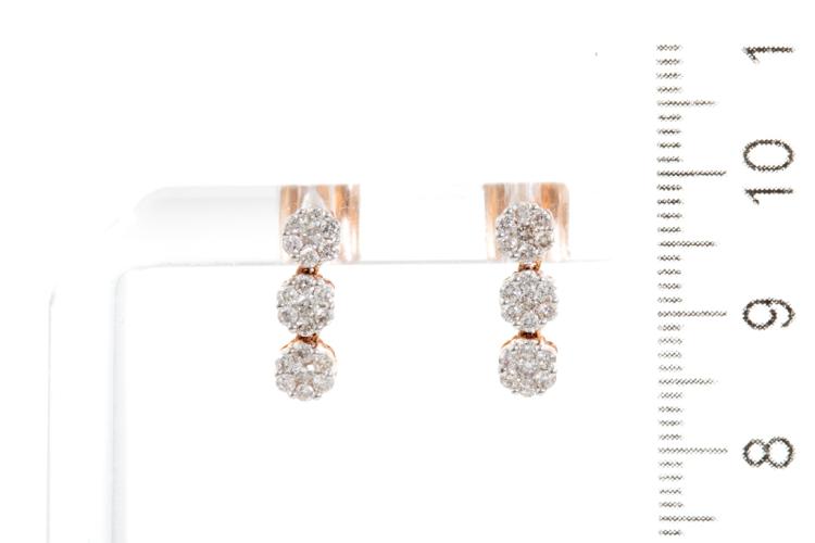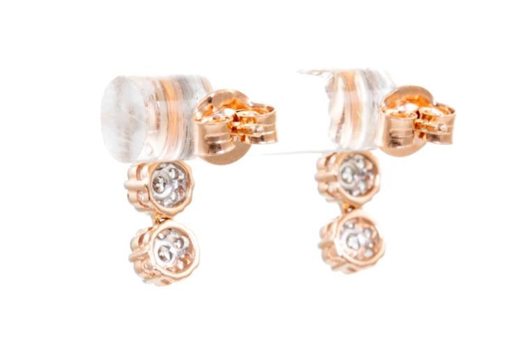 Diamond earrings with 42 round diamonds totalling 0.59cts. (Estimated grading: H SI). 14ct rose gold with white gold tips. Weight: 1.9g. (New)