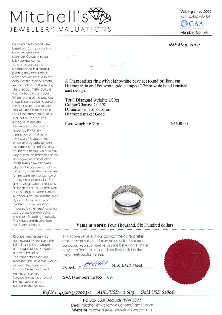 Diamond dress ring with round Natural Diamonds totalling 1.00ct (Estimated grading: G-H SI). 18ct white gold. Ring size Q1/2. Band width: 7.7mm. Weight: 6.7g. With Valuation dated 16/05/22. (Pre-owned)