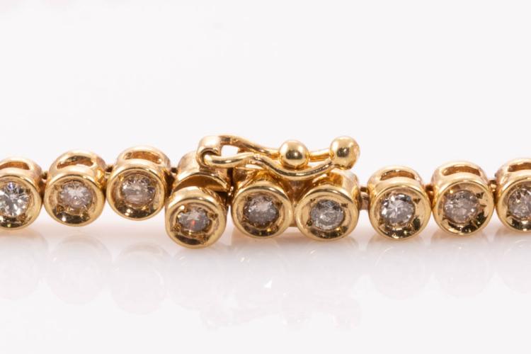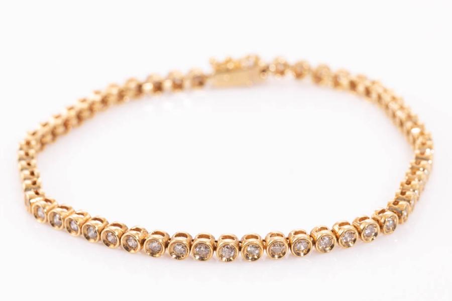Diamond tennis bracelet with 56 round Natural Diamonds totalling 1.00cts (Estimated grading: J-L SI-P1). 18ct yellow gold. Length: 18cm. Weight: 10.3g. (Pre-owned)