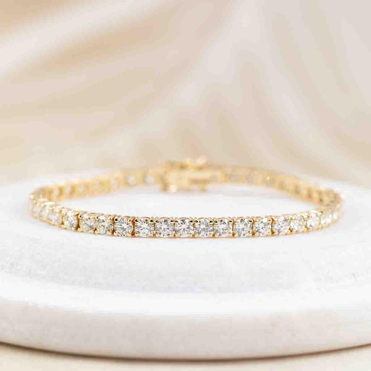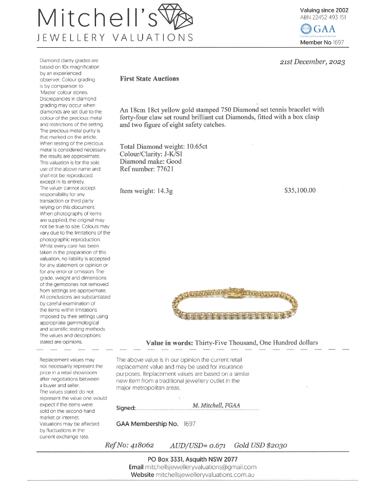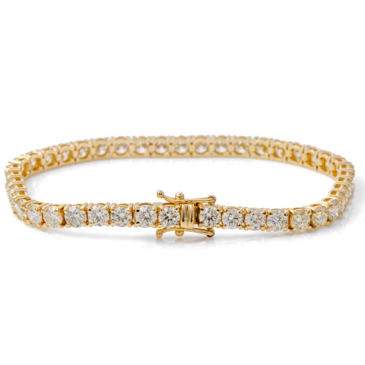 Diamond tennis bracelet with 44 round brilliant cut Natural Diamonds totalling 10.65cts. (Estimated grading: J-K SI) 18ct yellow gold. Length: 18cm. Weight: 14.3g. With Valuation Certificate #418062. (New)