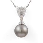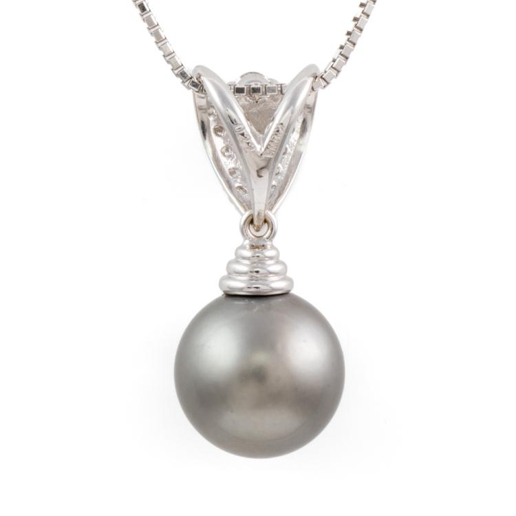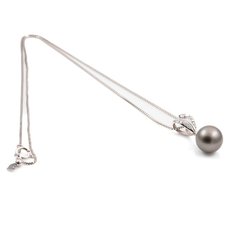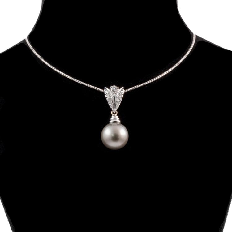Pearl and Diamond pendant with a Tahitian Pearl of 11.1mm and round Diamonds totalling 0.22cts. 18ct white gold with adjustable 45cm chain. Weight: 6.8g. (Pre-owned)
