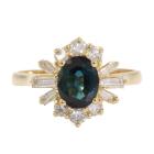 Sapphire and Diamond ring with an oval shape dark greenish blue Natural Sapphire of 1.18ct and round & baguette cut Natural Diamonds totalling 0.67ct (Estimated grading: I-J SI). 18ct yellow gold. Ring size N3/4. Band width: 2.8mm-1.8mm. Weight: 4.2g. (As new)