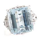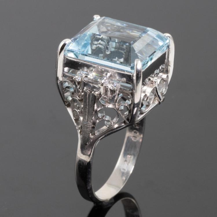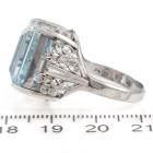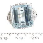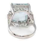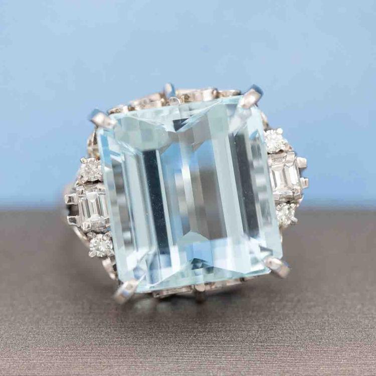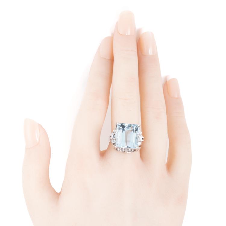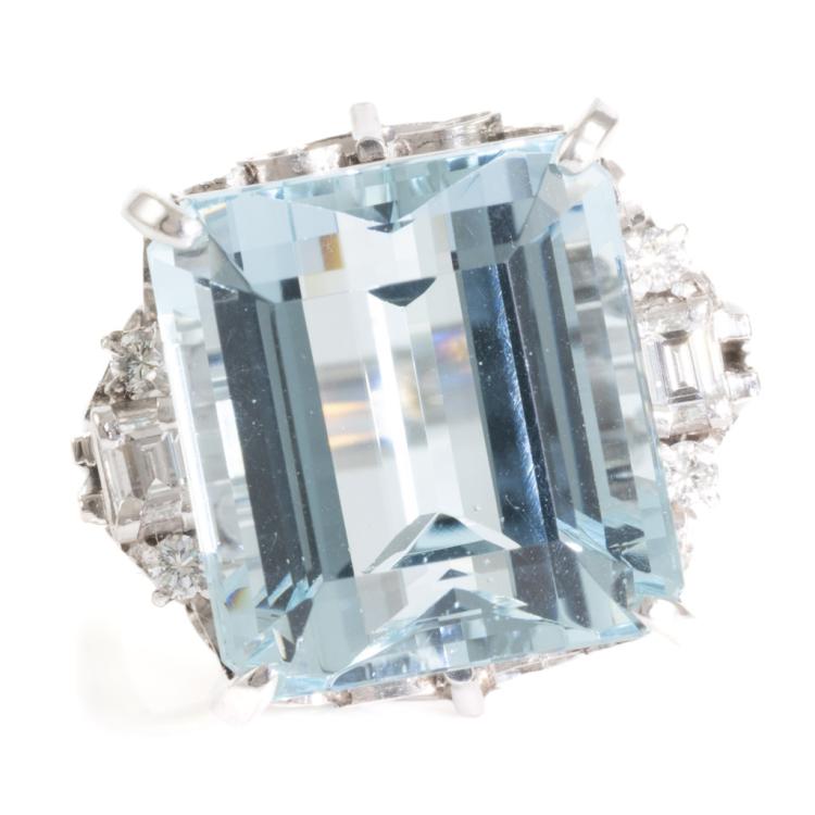 Aquamarine and Diamond ring with emerald cut Natural Aquamarine of 12.40ct and round & baguette cut Natural Diamonds totalling 0.35cts (Estimated grading: G VS). Platinum 900. Ring size O1/2. Band width: 3.1mm. Weight: 11.2g. (Pre-owned)