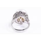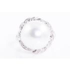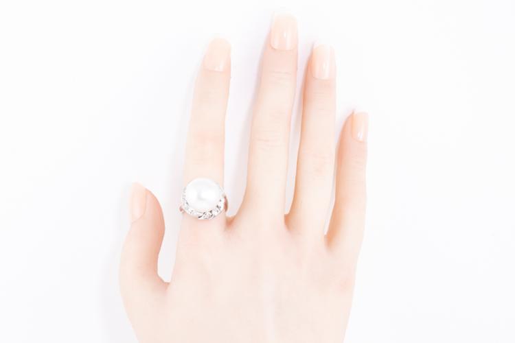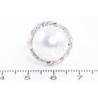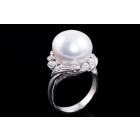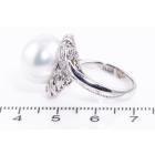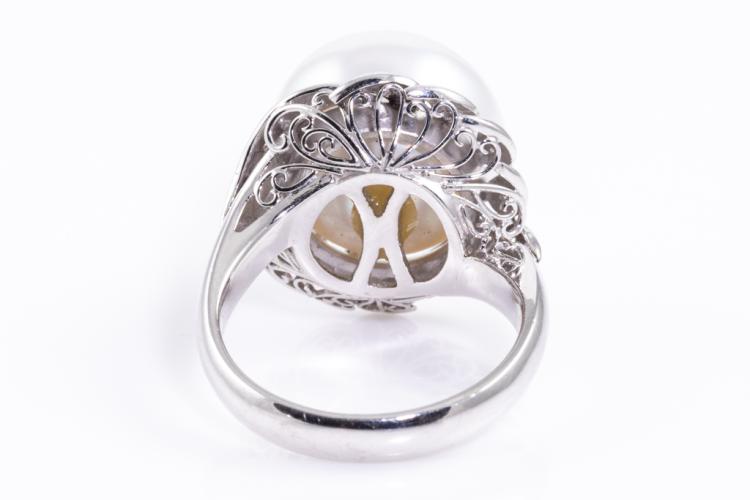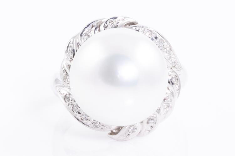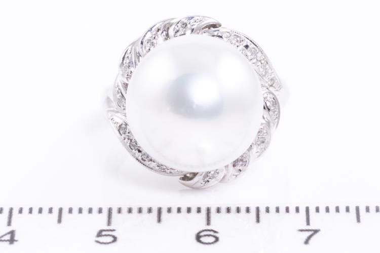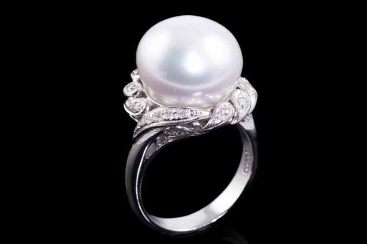 Pearl and Diamond ring with button shape South Sea Pearl of 14mm and round Natural Diamond totalling 0.12cts. Platinum 900. Ring size M. Band width: 3.4mm. Weight: 12.7g. (Pre-owned)