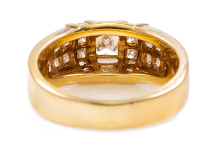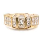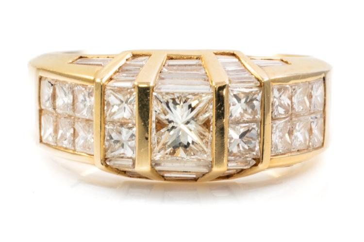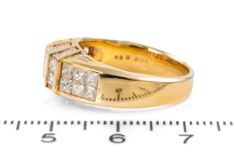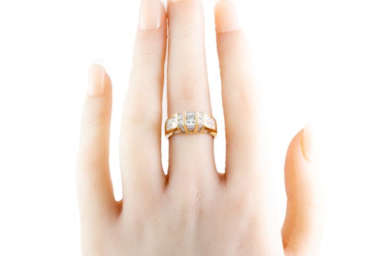 Diamond ring with a centre princess cut natural Diamond of 0.42ct (Estimated grading: H-I VS) and remaining princess cut and baguette cut natural Diamonds totalling 1.66cts (Estimated grading: H SI). 18ct yellow gold. Ring size M - no resizing. Weight: 8.0g. (Pre-owned)
