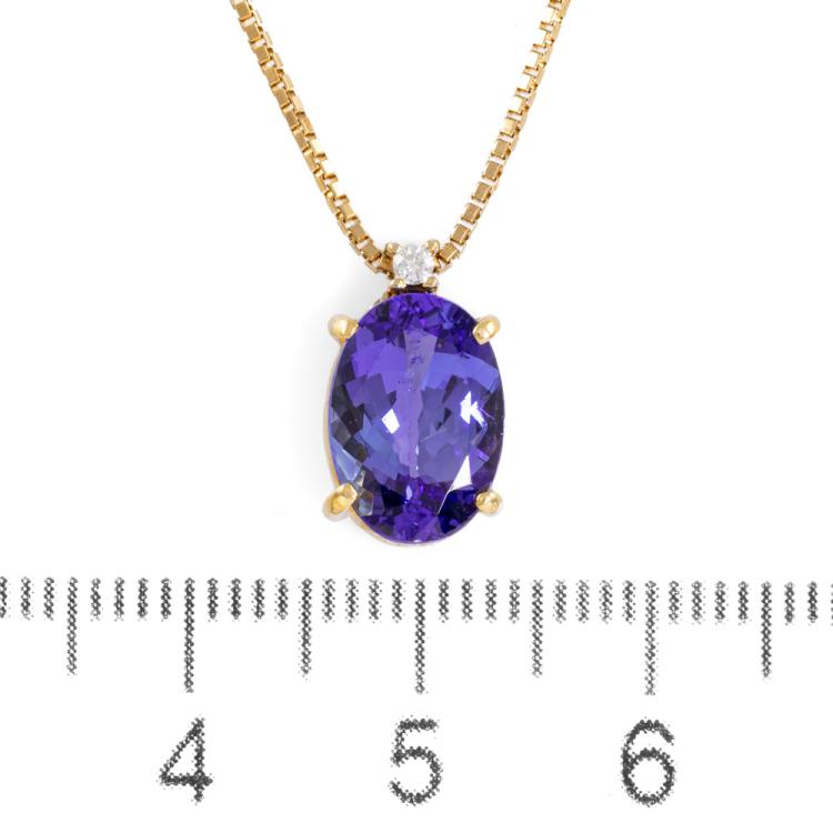 Tanzanite and Diamond Pendant with oval shape natural Tanzanite of 2.62ct and round Natural Diamond of 0.02ct. 18ct yellow gold with 60cm 18ct yellow gold adjustable chain. Weight: 5.5g. (Pre-owned)