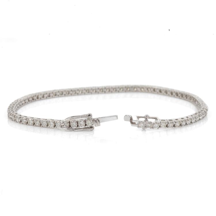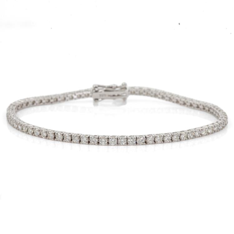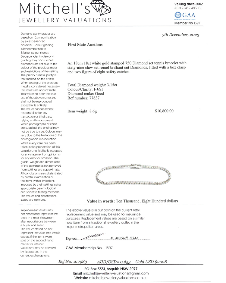Diamond tennis bracelet with 69 round brilliant cut Natural Diamonds totalling 3.15cts. (Estimated grading: I-J SI). 18ct white gold. Length: 18cm. Weight: 8.6g. With Valuation Certificate #417983. (New)
