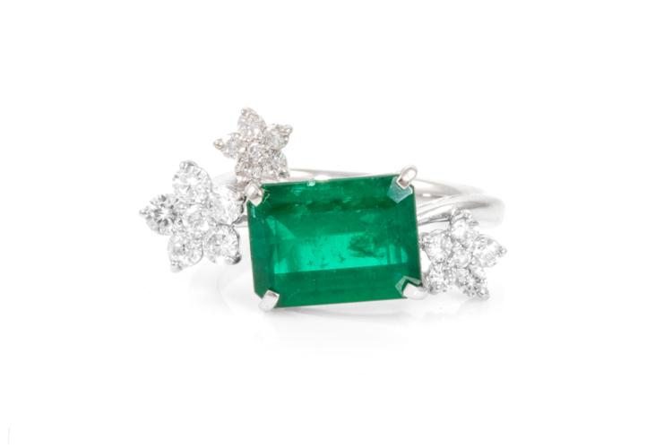 Emerald and Diamond ring with emerald cut vivid green Brazilian Natural Emerald of 3.16ct and round Natural Diamonds totalling 0.61cts (Estimated grading: G-H SI). Platinum-900. Ring size M. Weight: 7.1g. With GRS Certificate #GRS2023-018924. (Pre-owned)