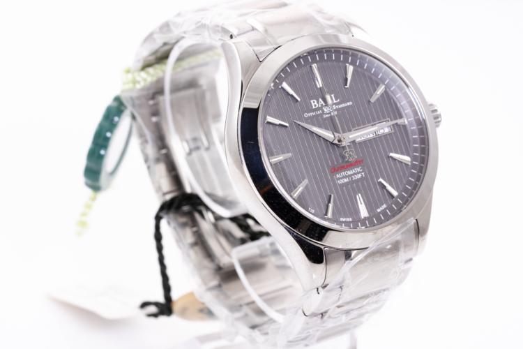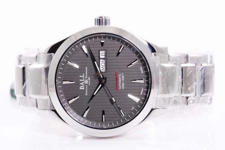 Ball Engineer II stainless steel automatic mens watch. Grey dial, day & date, case diameter: 43mm, wrist size: 18.5cm, Swiss made. Ref# NM2028C-SCJ-GY. With Ball stainless steel bracelet and clasp. With Ball Premium International Warranty Certificate Card, Ball Chronometer Certificate and Ball box. 12 month FSA warranty (As new, Note: case and bracelet on original wrapping)