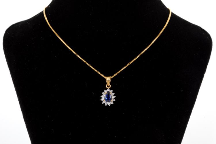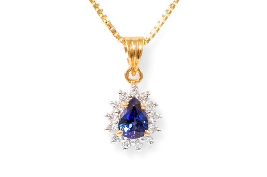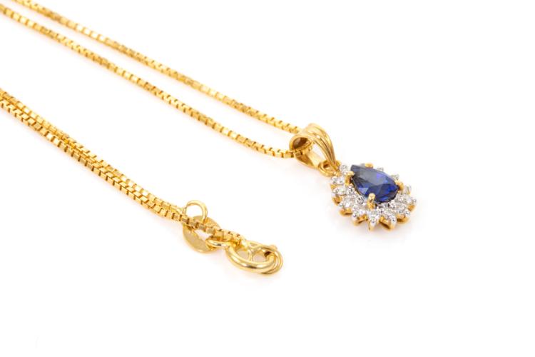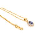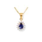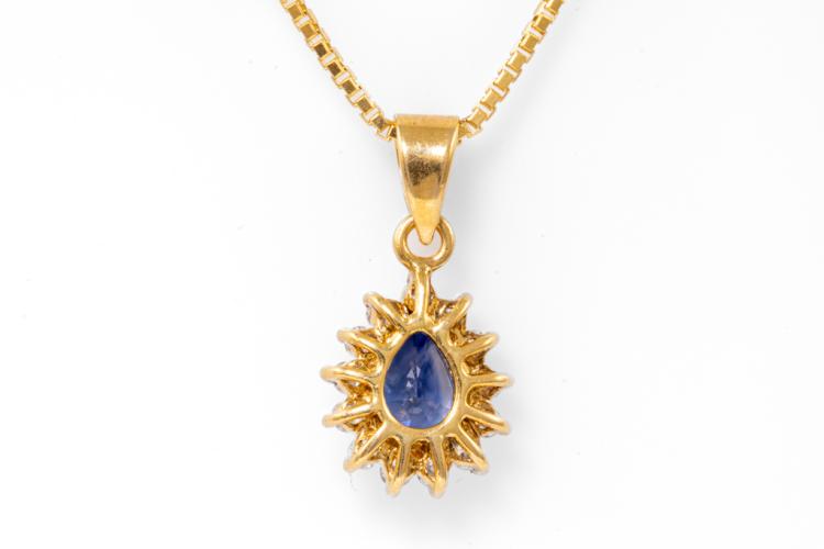 Sapphire and Diamond pendant with pear shape blue Natural Sapphire of approximately 0.68ct and Natural Diamonds totalling approximately 0.07cts. 18ct yellow gold with 18ct yellow gold 40cm chain. Weight: 4.0g. (Pre-owned)