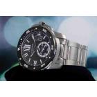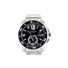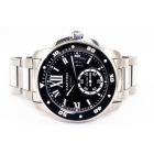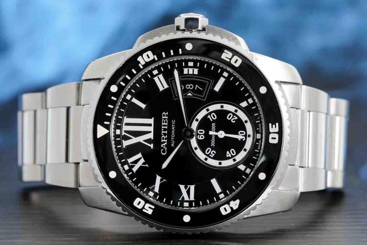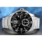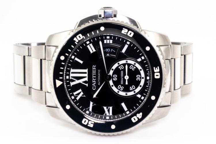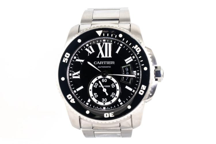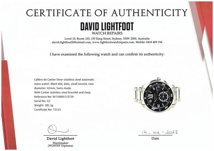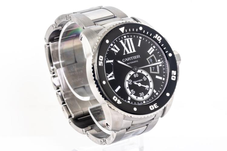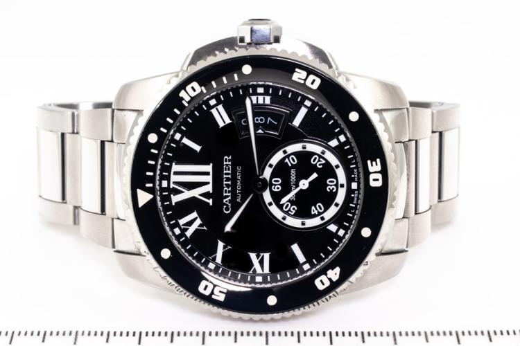 Calibre de Cartier Diver stainless steel automatic mens watch. Black dial, date, small second, case diameter: 42mm, wrist size: 17.5cm, Swiss made. Ref# W7100057/3729. With Cartier stainless steel bracelet and clasp. With Certificate of Authenticity. 3 month FSA warranty. (Pre-owned)