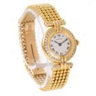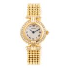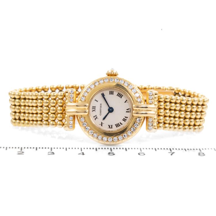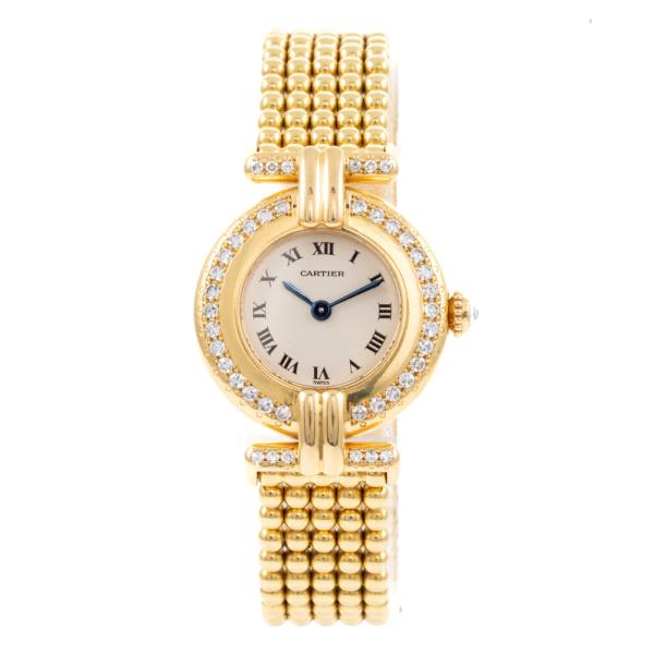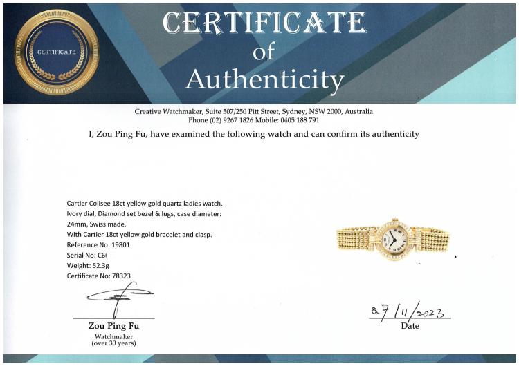 Cartier Colisee 18ct yellow gold quartz ladies watch. Ivory dial, Diamond set bezel & lugs, case diameter: 24mm, wrist size: 15.5cm, Swiss made. Ref# 19801. With Cartier 18ct yellow gold bracelet and clasp. With Certificate of Authenticity, Cartier International Guarantee booklet dated 18/03/1999 and Cartier box with pouch. 3 month FSA warranty (Pre-owned)