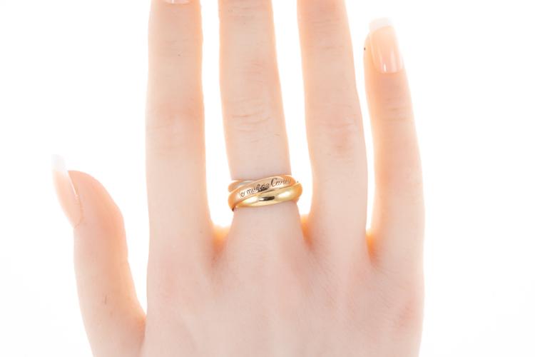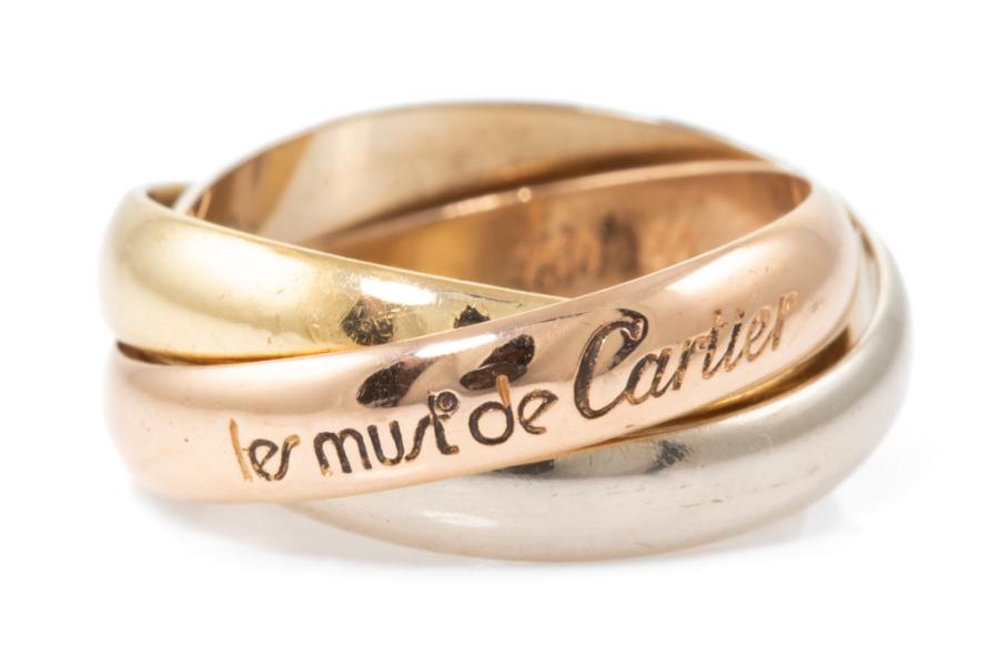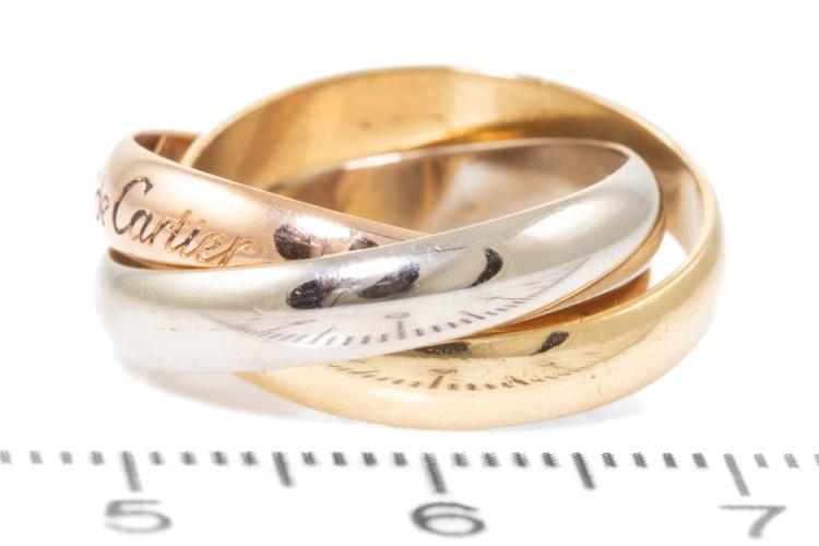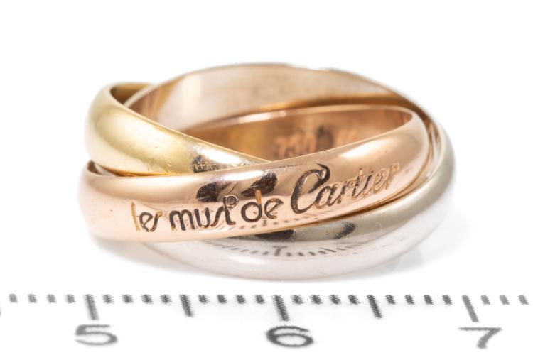 Cartier trinity ring. 18ct yellow, rose and white gold. Stamped size 50, K - ring resizing is not recommended. With Cartier box. Weight: 7.4g. (Pre-owned)