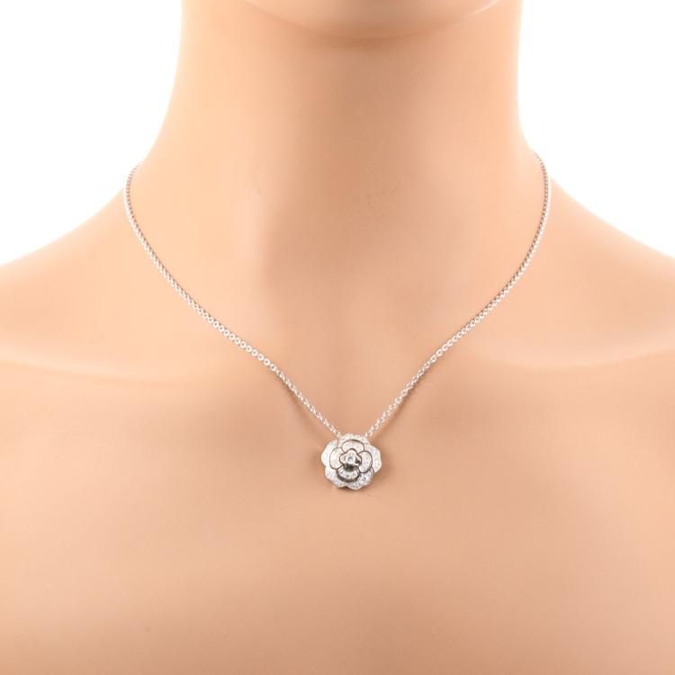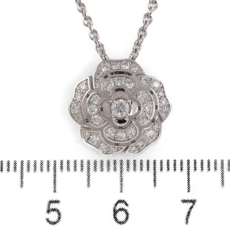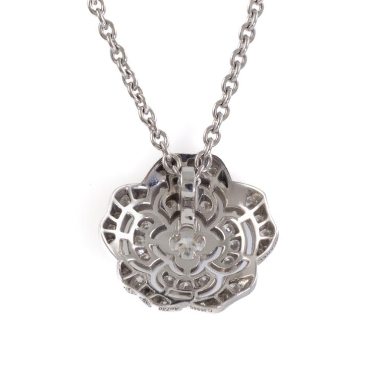 Chanel Bouton De Camelia necklace with 38 natural round Diamonds totalling approximately 0.40ct (Estimated grading: F-G VS). 18ct white gold with 44.5cm chain. Weight: 6.2g. With Chanel box and Chanel Certificate. (Pre-owned)