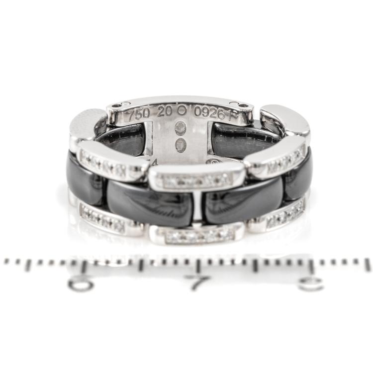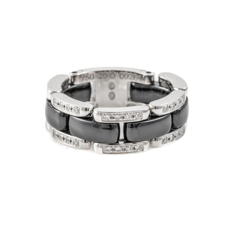 Chanel ultra Diamond ring with round Natural Diamonds totalling 0.24cts. 18ct white gold and ceramic. Ring size N, - ring resizing is not recommended. Band width: 7mm. Weight: 10.2g. (Pre-owned)