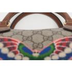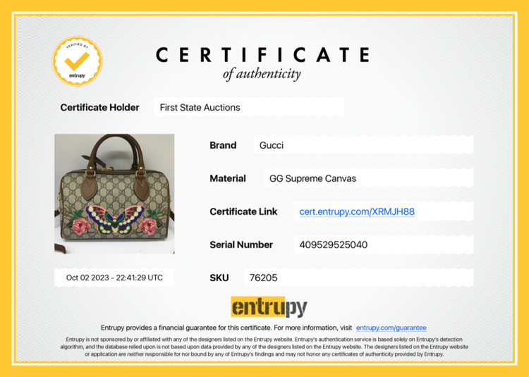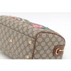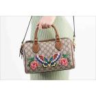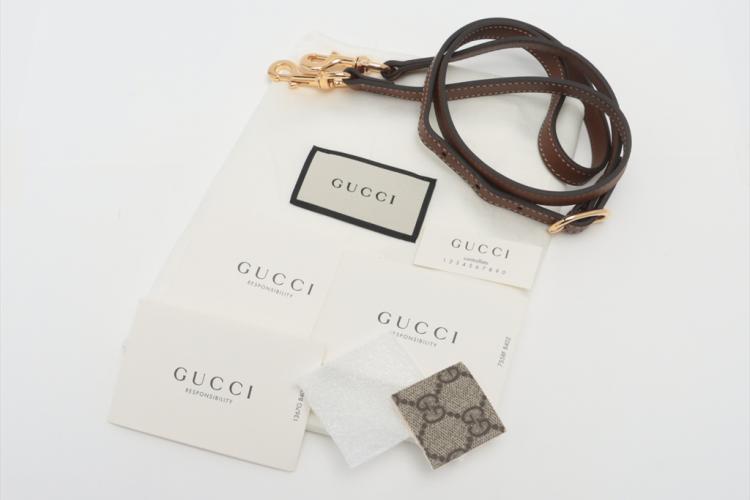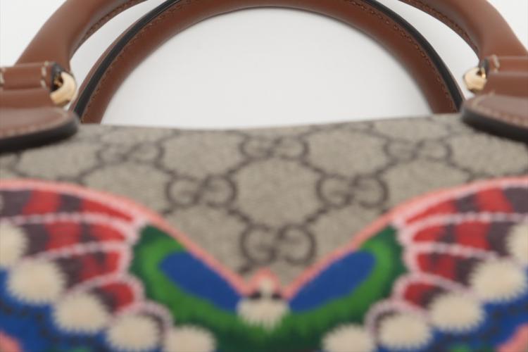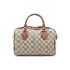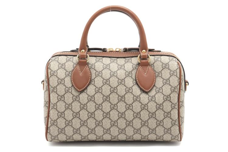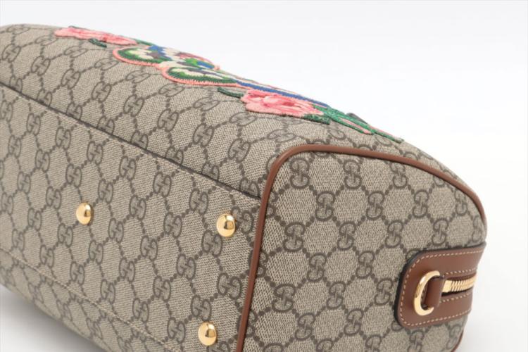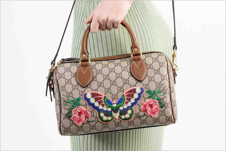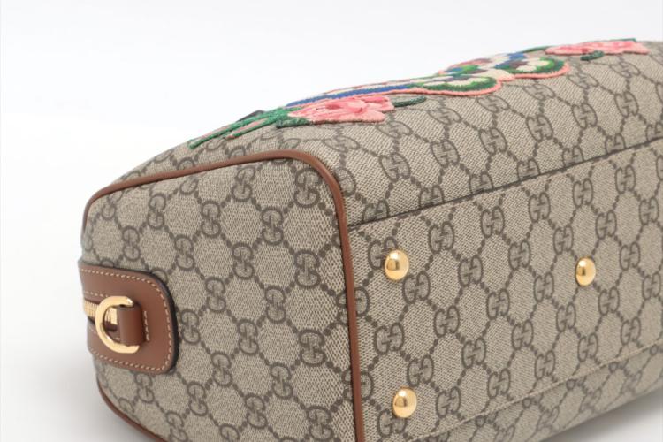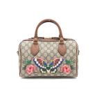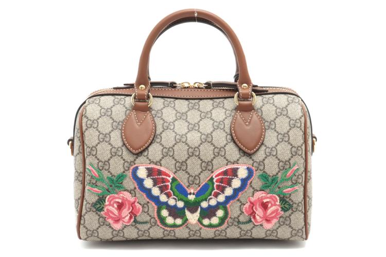 Gucci GG Supreme PVC and leather beige × brown 2way top-handle Boston Bag with butterfly embroidery. With gold-toned hardware. The bag opens with a two-way zipper, revealing a pink suede interior that features two patch pockets and a zipper pocket. Accompanied by a dust bag and detachable/adjustable leather strap. Approximate dimensions: 26.5cm(L) x 17.5cm(H) x 14.5cm(D), handle height 8.5cm, strap length (up to) 51cm. With Entrupy Certificate of Authenticity. (Pre-owned)