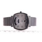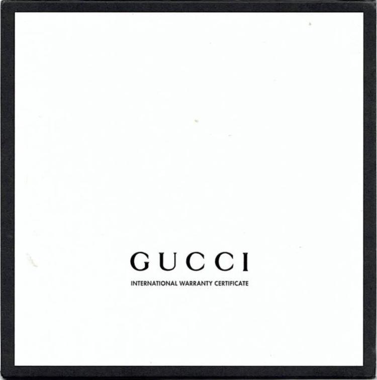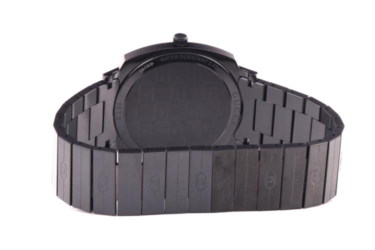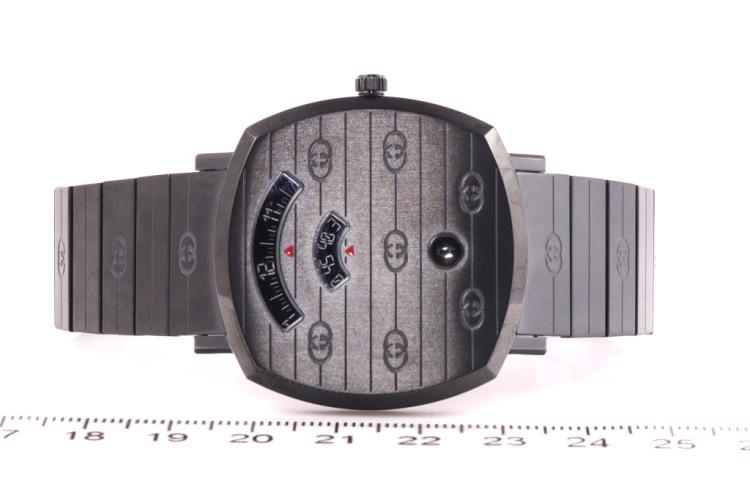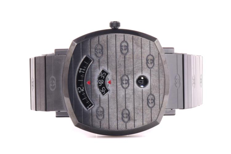 Gucci Grip black PVD stainless steel quartz watch. Black stainless steel case with analogue hour, second & date window, case diameter: 35mm, strap length: 17.5cm, Swiss made. Ref# YA157429. With Gucci black PVD stainless steel bracelet and clasp. 3 month FSA warranty. With Gucci International Warranty Certificate - Certificate is not stamped so Gucci warranty does not apply. Box is not provided. (As new, NOTE: minor scratches on face and bracelet due to being display stock)
