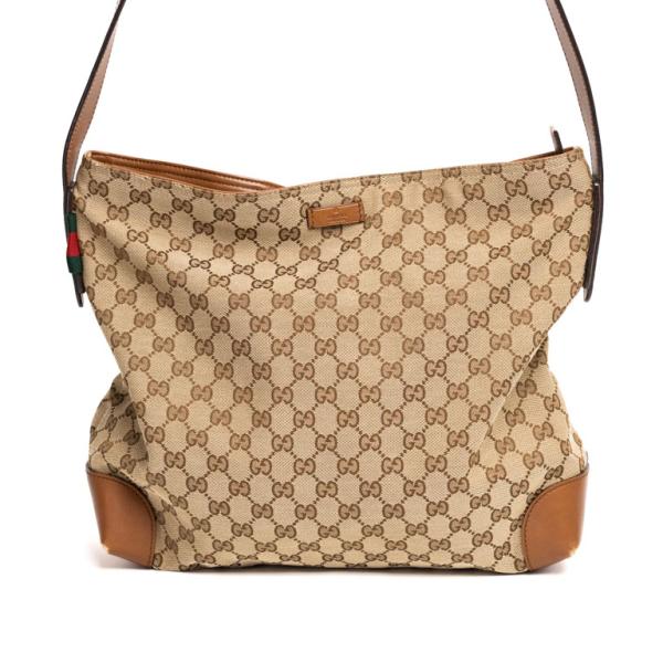 Gucci large original GG canvas messenger bag with silver-toned hardware. Featuring in beige/ebony original GG canvas with leather trims and web tag, a Gucci logo leather tag embossed at front, the top with zip closure opens to a cotton linen lining interior with zipped and patch pockets. Approximate dimensions: 36cm(W) x 29cm(H) x 11cm(D), 54cm leather, adjustable cross body strap drop. With Entrupy Certificate of Authenticity. (Pre-owned)