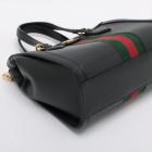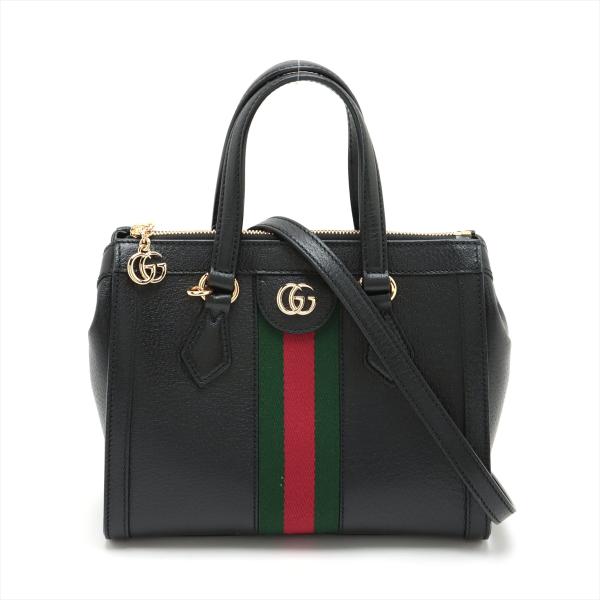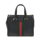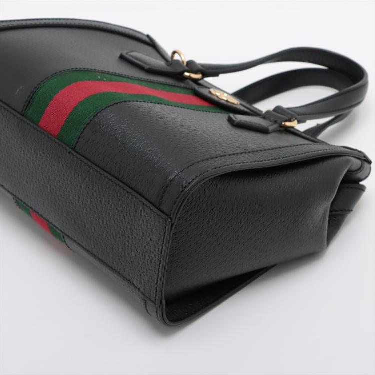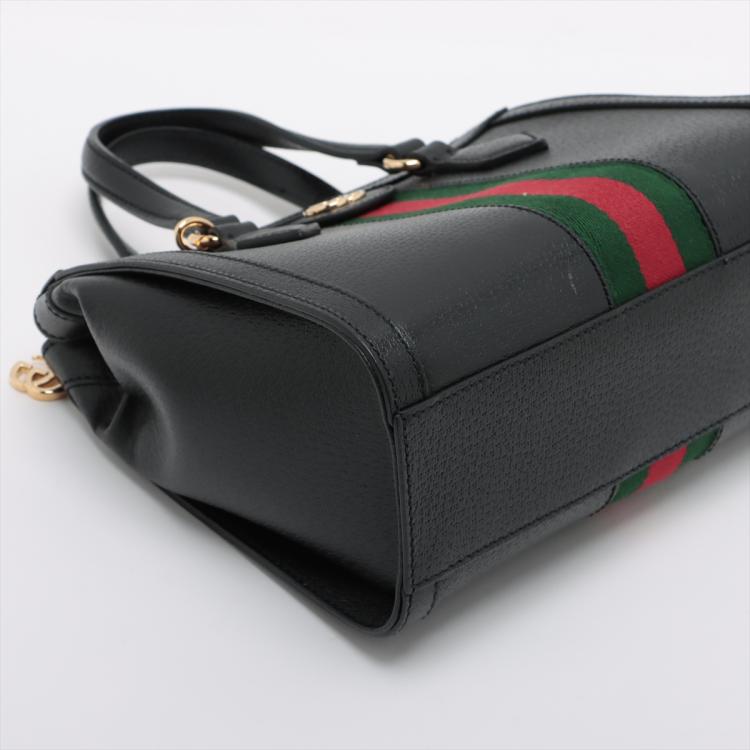 Gucci small Ophidia web tote in black leather. Featuring black leather trim, green & red web stripe, gold-toned hardware, dual leather top handles, zip closure with GG logo charms. The top opens to a blush pink suede interior with a patch pocket. Approximate dimensions: 24cm (L) x 20.5cm (H) x 10.5cm (D), 7cm handle drop and 62cm (max) detachable and adjustable strap drop. Accompanied by Gucci booklets, dust bag and box. With Entrupy Certificate of Authenticity. (Pre-owned)