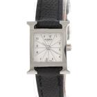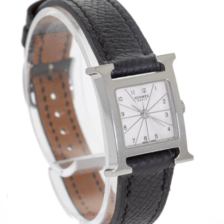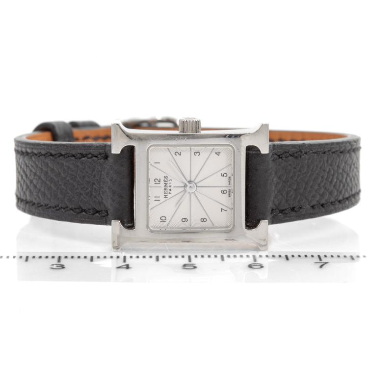 Hermes Heuer H mini stainless steel quartz ladies watch. Silver dial, case diameter: 21mm, strap length: 16.5cm, Swiss made. Ref# HH1.110. With Hermes black leather strap and buckle. With Certificate of Authenticity and Hermes box. 3 months FSA warranty (Pre-owned).