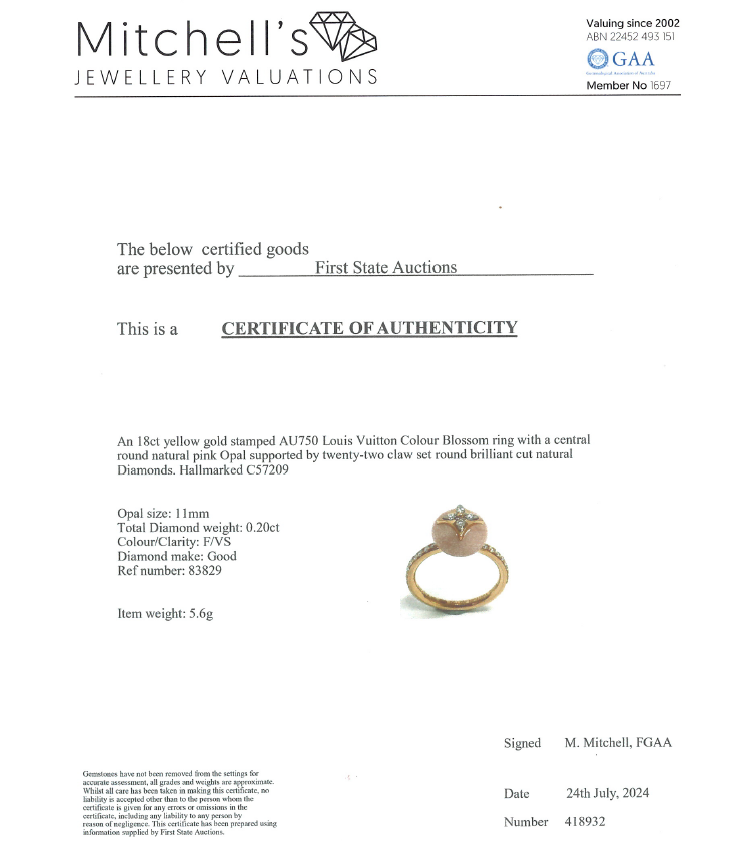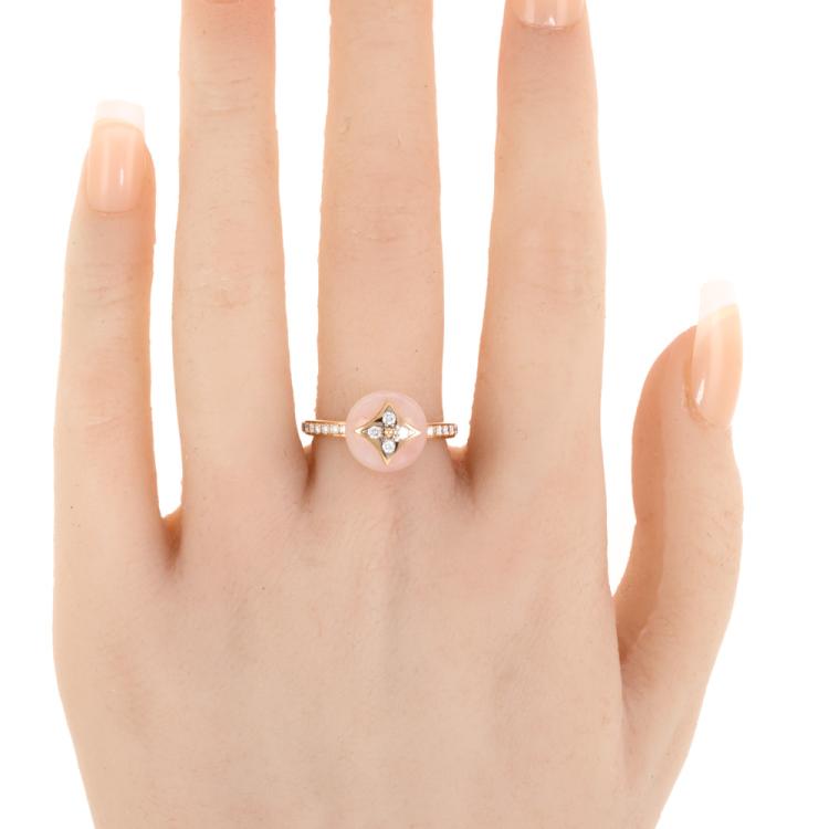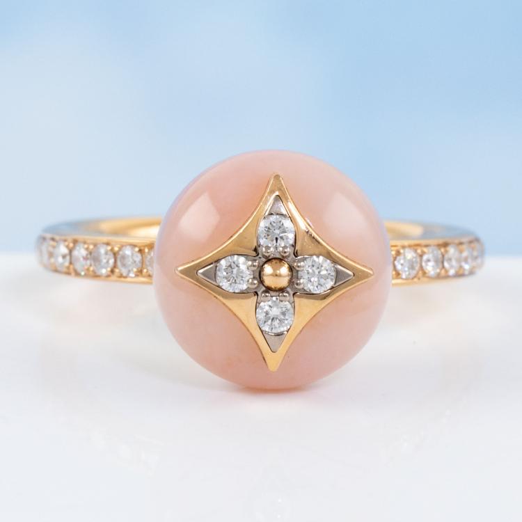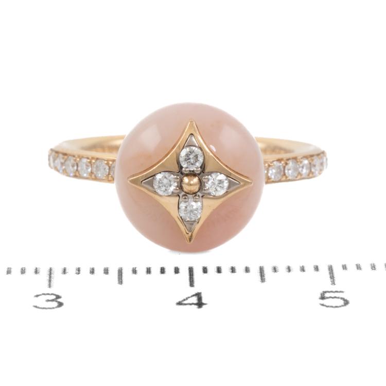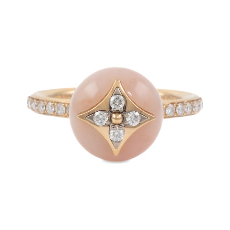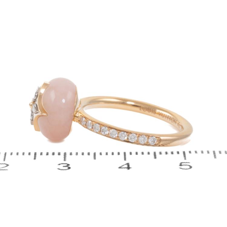 Louis Vuitton Colour Blossom ring with Monogram Flower motif, pink Natural Opal and 22 round Natural Diamonds totalling 0.20ct. Motif (ball) size 11mm. 18ct rose gold. Stamped size 54, N - ring resizing is not recommended. Band Width: 2.2mm. Weight: 5.6g. With Certificate #418932. (Pre-owned)