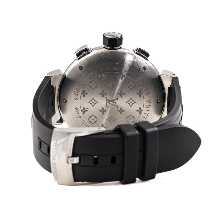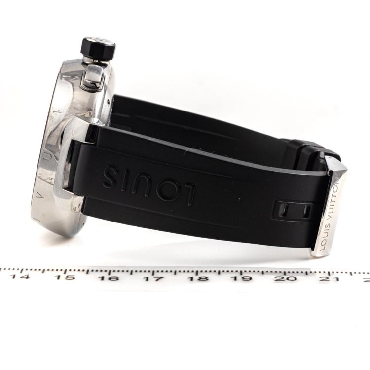 Louis Vuitton Tambour Flyback limited edition of 888 stainless steel automatic mens watch. Black Chronograph dial, date, case diameter: 44mm, strap length: 21cm, Swiss made. Ref# Q102B. With Louis Vuitton black rubber strap and buckle. With Certificate of Authenticity and Louis Vuitton box. 3 month FSA warranty. (Pre-owned)