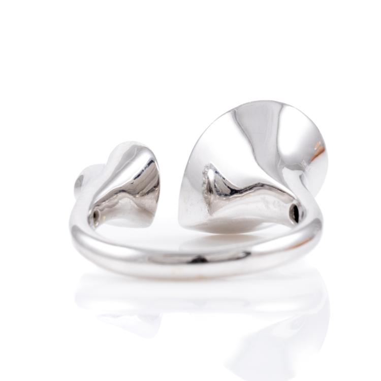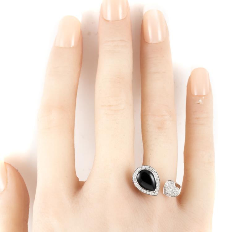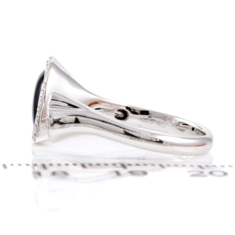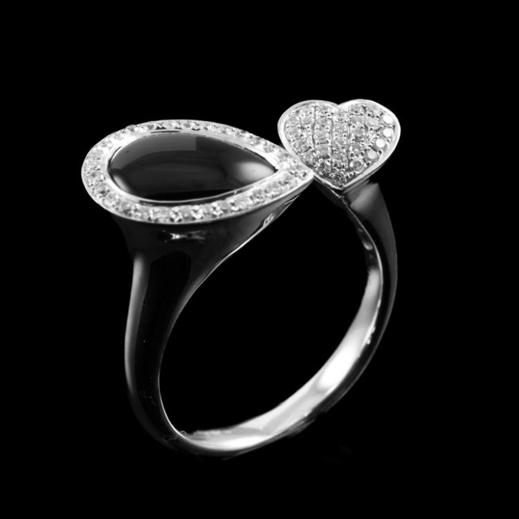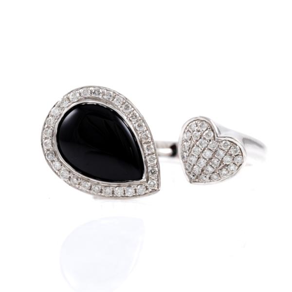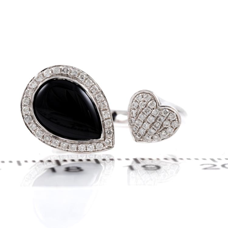 Onyx and Diamond open ring with pear shape Natural Onyx of size 9.5mm x 6.9mm and Natural Diamonds totalling 0.26cts. 18ct white gold. Ring size L. Band width: 2.5mm. Weight: 4.8g. (Pre-owned)
