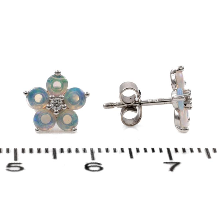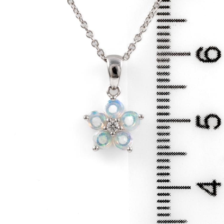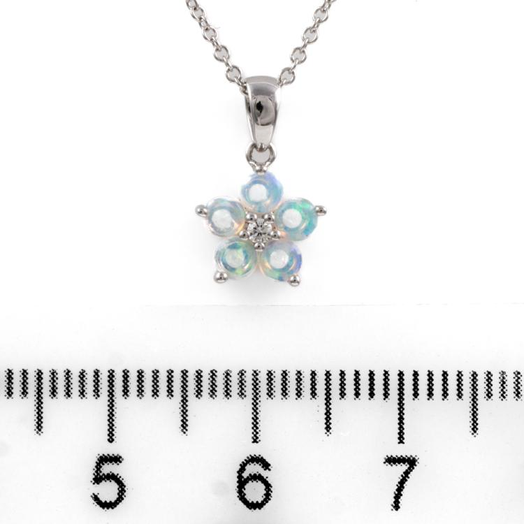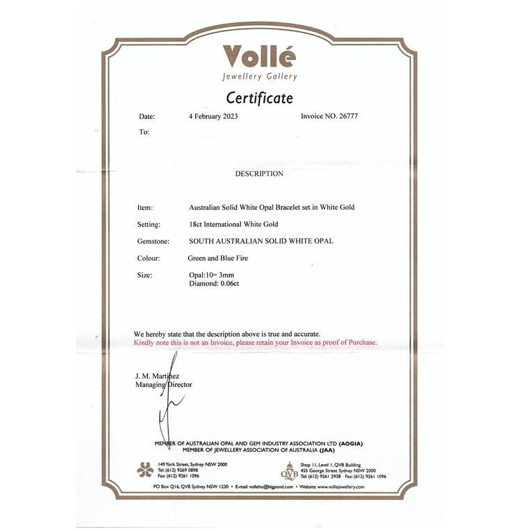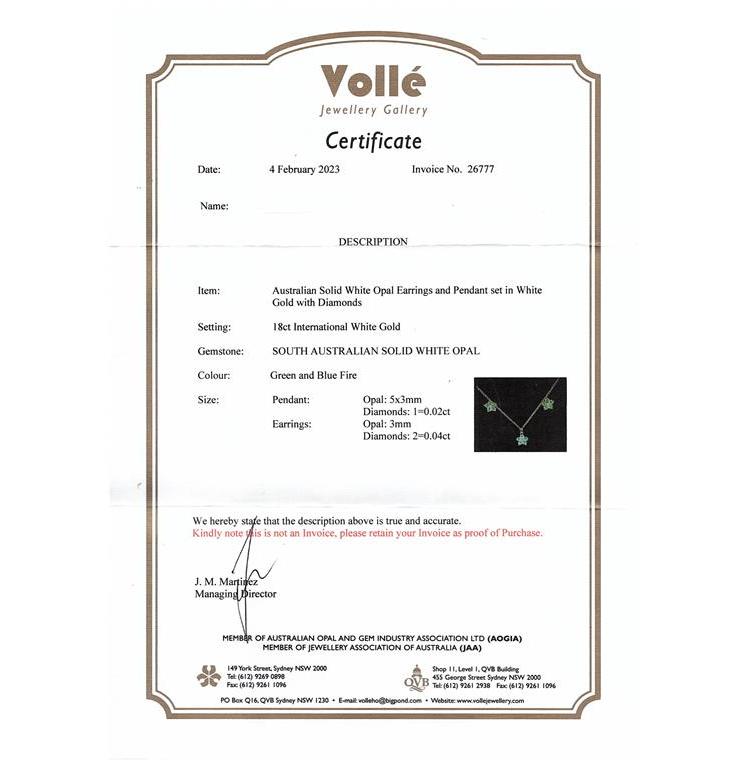 Set of Solid White Opal & Diamond Earrings, bracelet & pendant. Opal & Diamond Bracelet with 15 white Opals & Diamonds. 18ct white gold. Weight: 10.4g. With Certificate dated 4/4/23. Opal & Diamond pendant with 5 white Opals & Diamonds totalling 0.02cts. 18ct white gold with 14ct white gold 40cm chain. Weight: 1.9g. Earrings with 10 white Opals & Diamonds totalling 0.04cts. 18ct white gold. Weight: 1.6g. Both in one certificate dated 4/4/23. With Box. (Pre-owned)