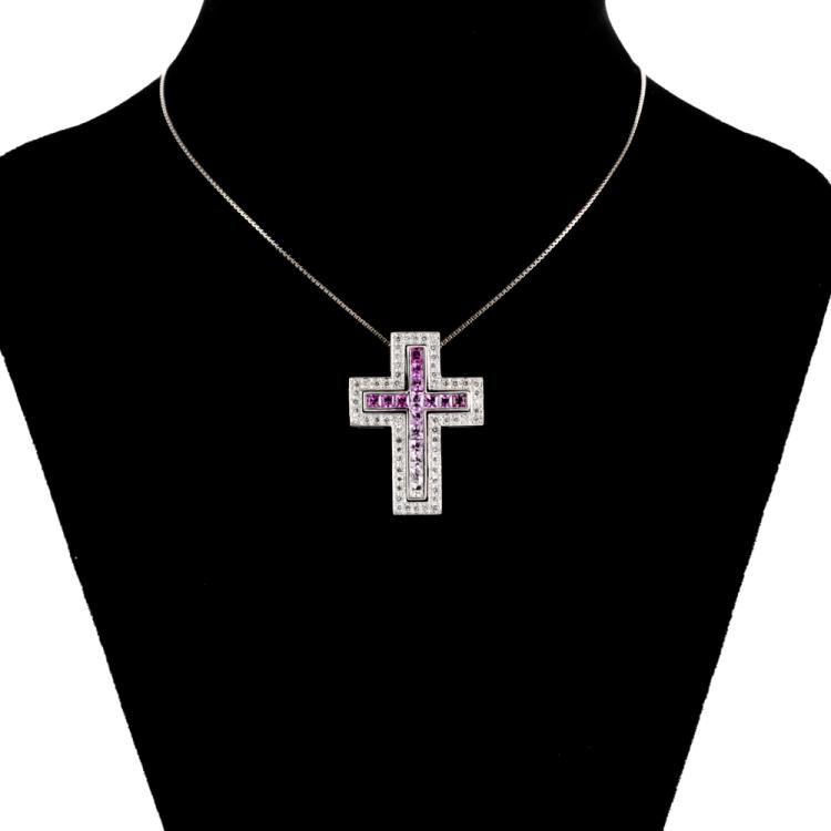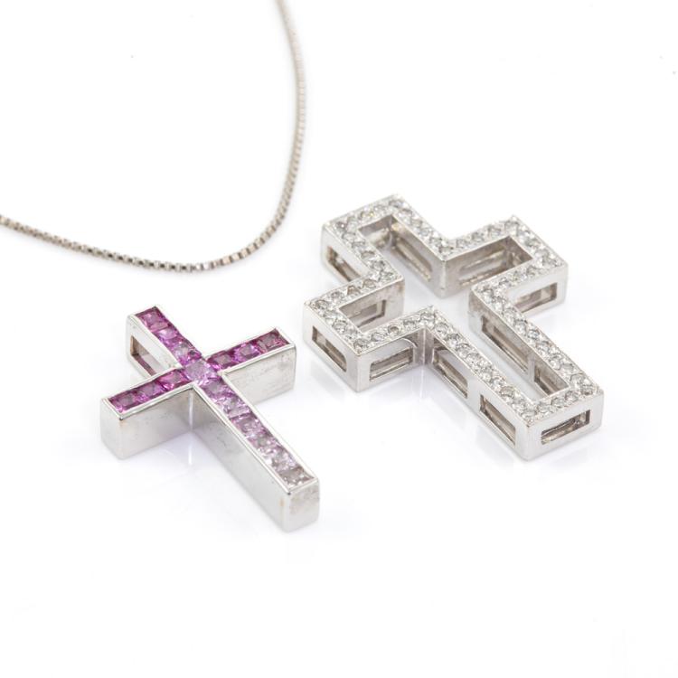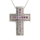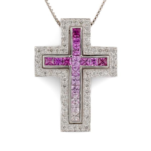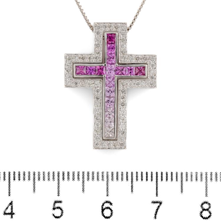 Sapphire and Diamond cross detachable pendant with princess cut pink Natural Sapphire totalling 0.87cts and round Natural Diamonds totalling 0.33cts (Estimated grading: H SI). 18ct white gold with 18ct white gold 46cm chain. Weight: 8.8g. (Pre-owned)