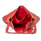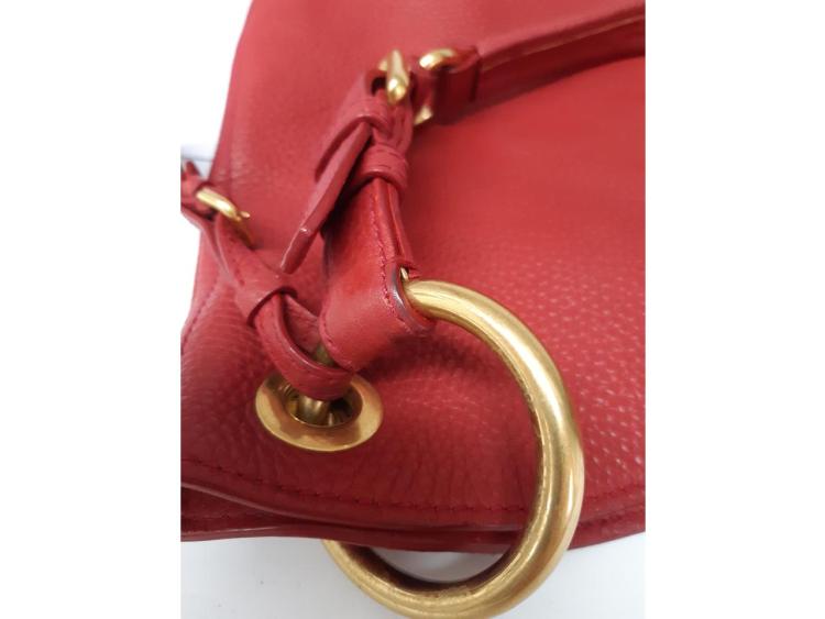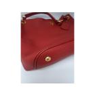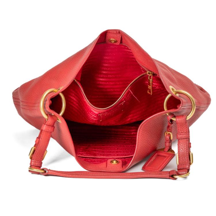 Prada Vitello Daino open tote bag in red grainy calfskin leather with gold-toned hardware. Featuring a flat leather, adjustable strap, an open top with a snap button closure. The top opens to a red, logo printed fabric lining interior with zipped and flat pockets. Approximate dimensions: 38cm(W) x 30cm(H) x 20cm(D), 26cm strap drop. Accompanied by a leather name tag and a Prada dust bag. With Entrupy Certificate of Authenticity. (Pre-owned)