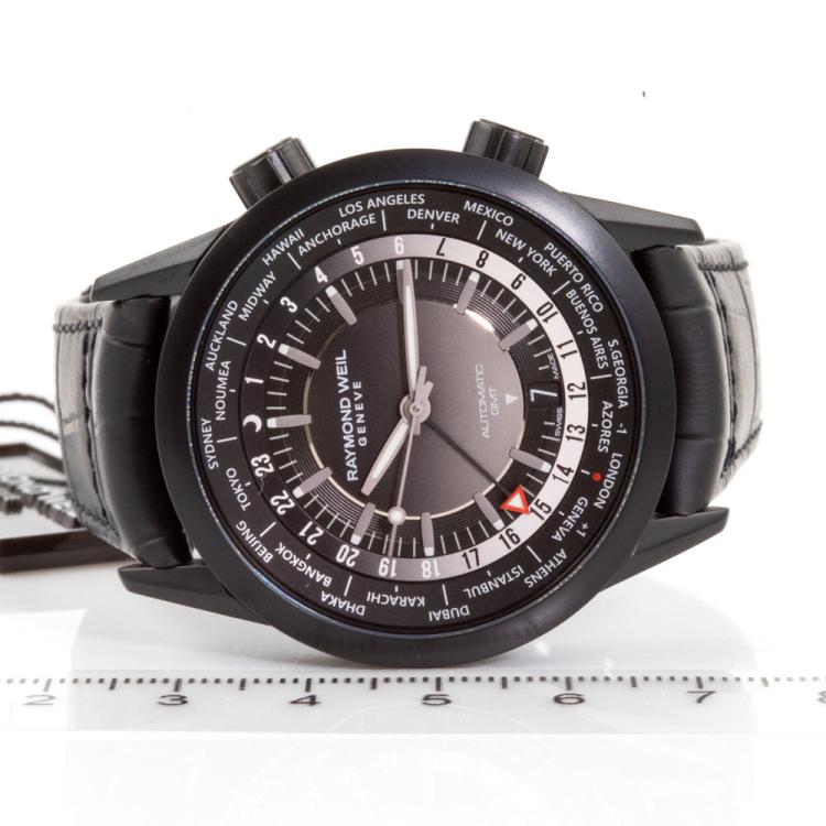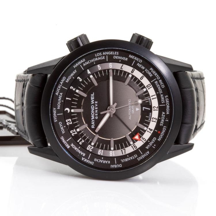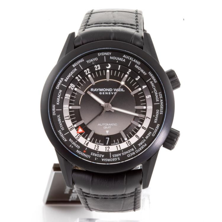 Raymond Weil Freelancer GMT Worldtimer stainless steel automatic mens watch. Black dial, date, case diameter: 41mm, strap length: 22cm, Swiss made. Ref# 2765-BKC-20001. With Raymond Weil black leather strap and clasp. With Raymond Weil Guarantee card and Raymond Weil box. 12 month FSA warranty (As new, Note: case is on original wrap)