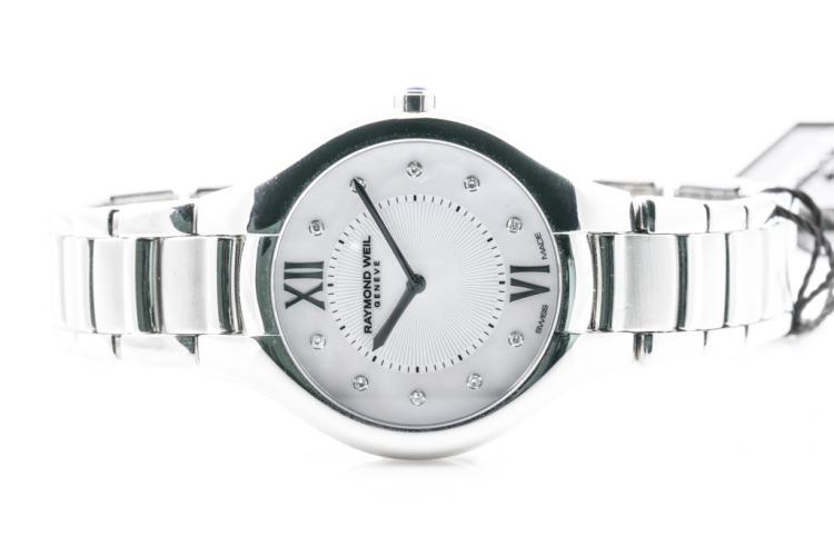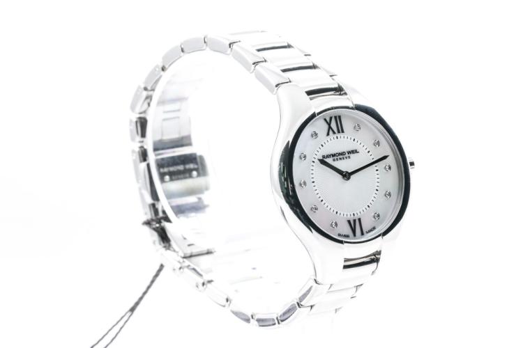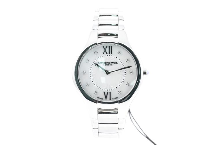Raymond Weil Noemia stainless steel quartz ladies watch. Mother of Pearl dial, Diamond indicators, case diameter: 32mm, wrist size: 17.5cm, Swiss made. Ref# 5132-ST-00985. With Raymond Weil stainless steel bracelet and clasp. With Raymond Weil Guarantee card and Raymond Weil box. 12 month FSA warranty. (As New, Note: scratches on case and bracelet due to being display stock)