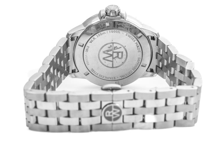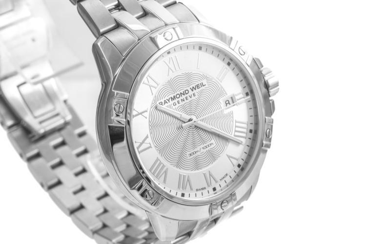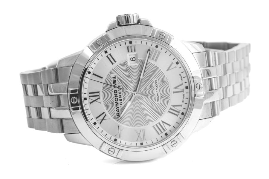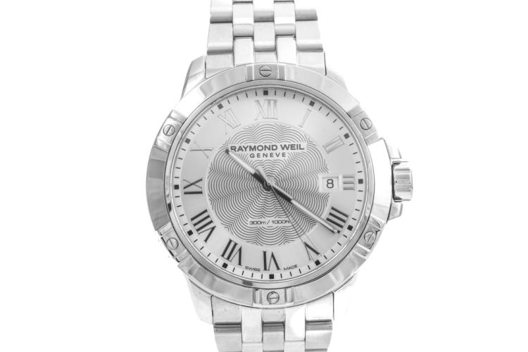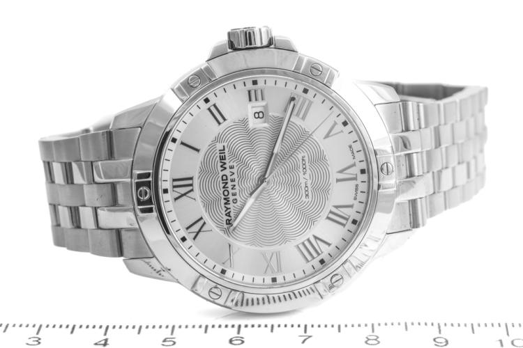 Raymond Weil Tango stainless steel quartz mens watch. Silver dial, date, case diameter: 41mm, wrist size: 20.5cm, Swiss made. Ref# 8160-ST-00658. With Raymond Weil stainless steel bracelet and clasp. With Raymond Weil International Guarantee card and Raymond Weil box. (As new, Note: minor scratches on case due to being display stock)