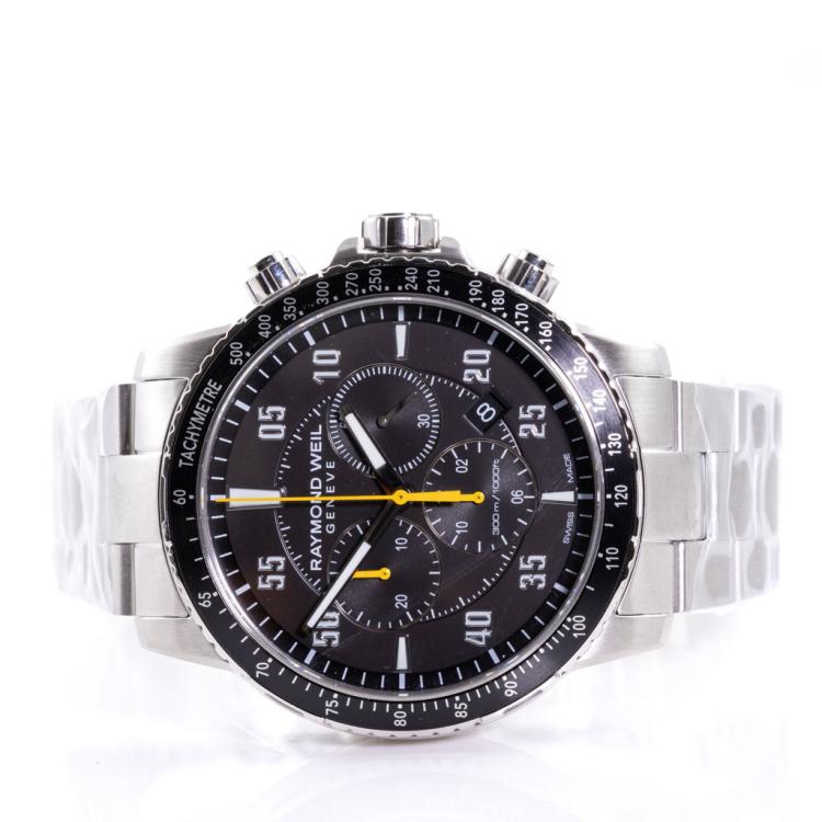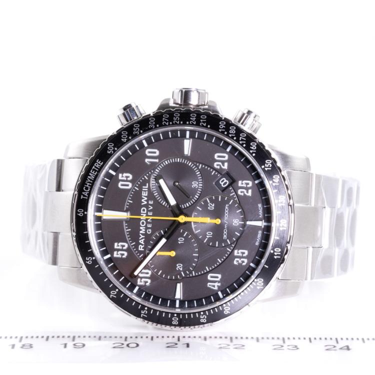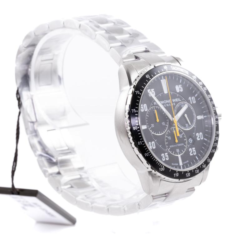 Raymond Weil Tango stainless steel quartz mens watch. Black chronograph dial, date, case diameter: 43mm, wrist size: 20.5cm, Swiss made. Ref# 8570-ST2-05207. With Raymond Weil stainless steel bracelet and clasp. With Raymond Weil Guarantee card and Raymond Weil box. 12 month FSA warranty (As new, case and bracelet in original wrapping)