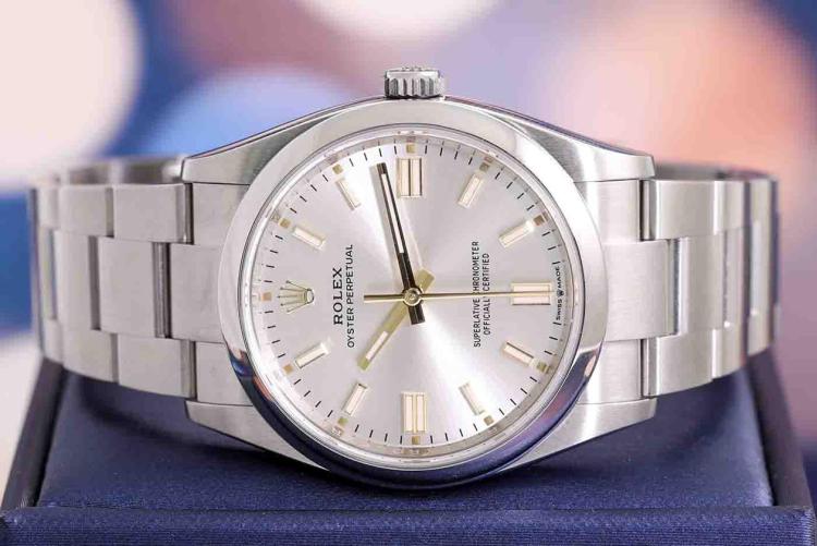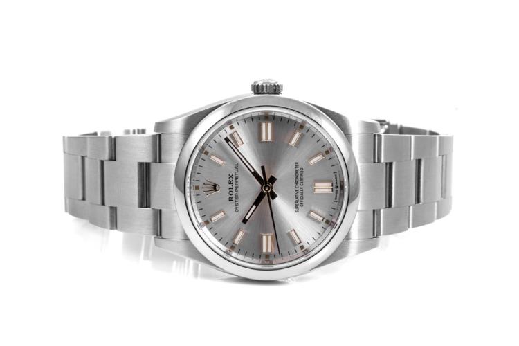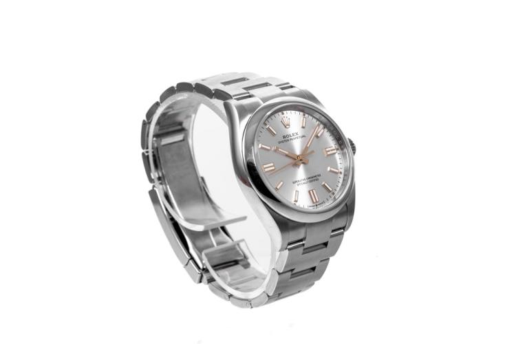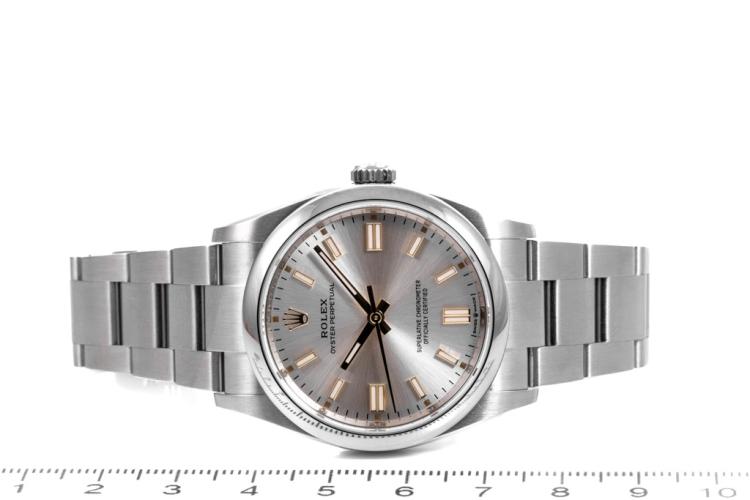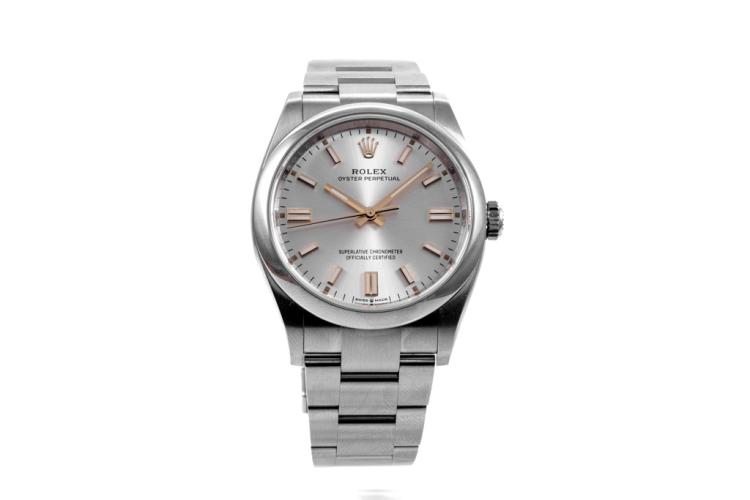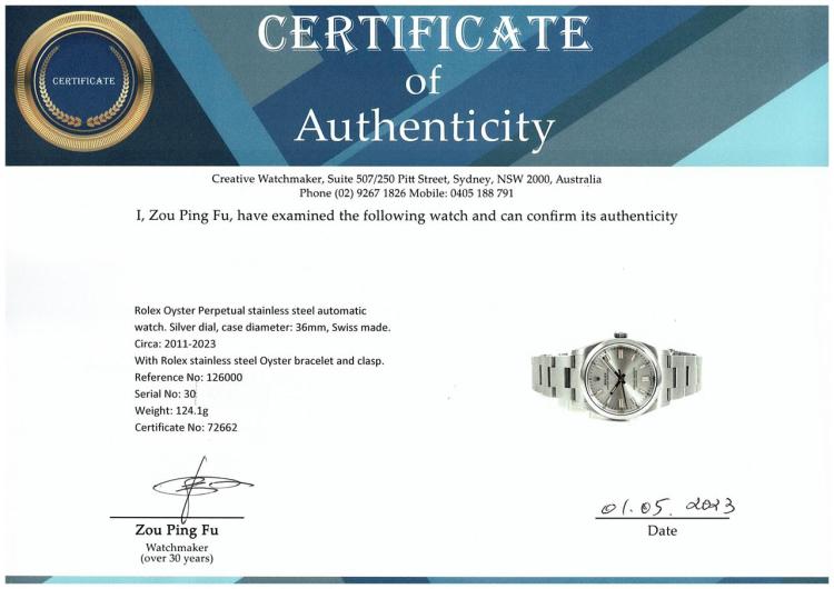 Rolex Oyster Perpetual stainless steel automatic watch. Silver dial, case diameter: 36mm, wrist size: 17cm, Swiss made. Ref# 126000. Circa: 2011-2023. With Rolex stainless steel Oyster bracelet and clasp. With Certificate of Authenticity, Rolex International Guarantee card dated 27/08/2022 and Rolex box. Balance of 5 year Rolex manufacturer warranty applies. (Pre-owned)