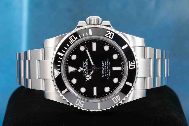 Rolex Oyster Perpetual Submariner stainless steel automatic mens watch. Black dial, case diameter: 40mm, wrist size: 21.5cm, Swiss made. Ref# 114060. Circa: 2010. With Rolex stainless steel Oyster bracelet and clasp. With Certificate of Authenticity and Rolex box. (Pre-owned)