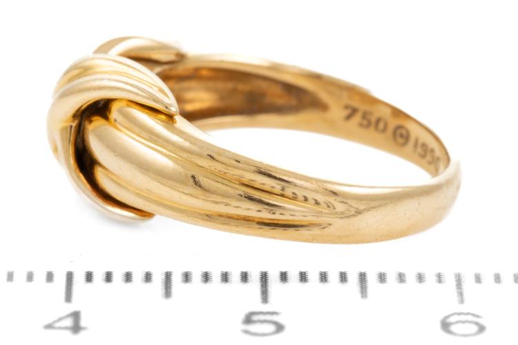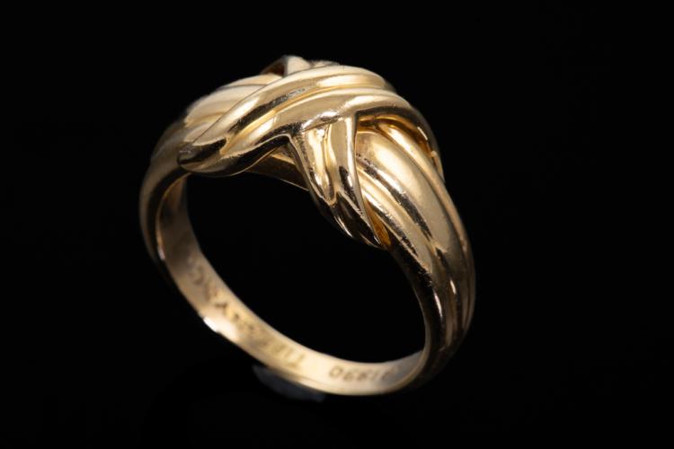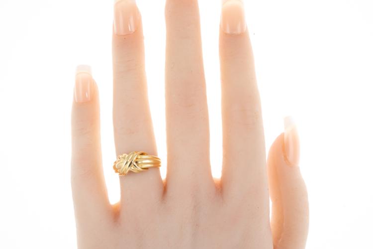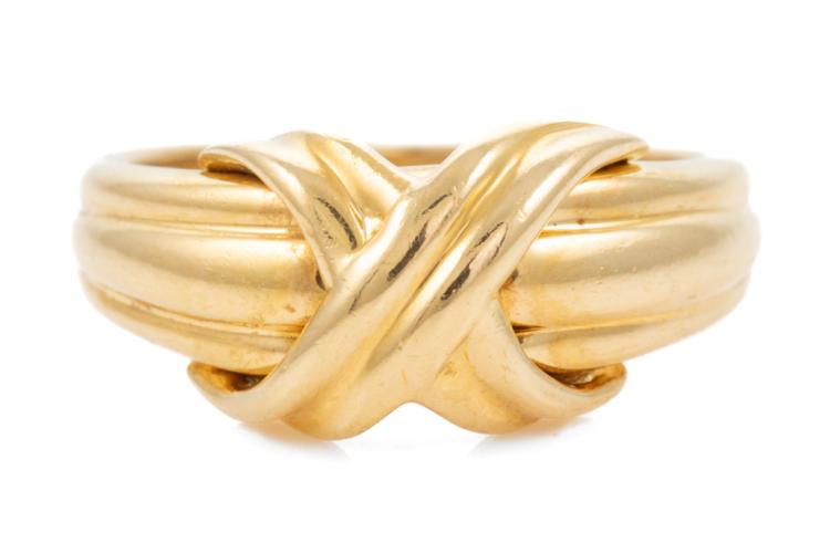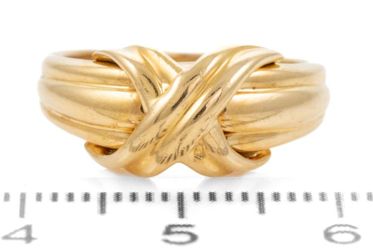 Tiffany & Co. Signature Cross ring. 18ct yellow gold. Circa 1990. Ring size K - ring resizing is not recommended. Band width: 2.4mm - 5.1mm. Weight: 5.3g. (Pre-owned)