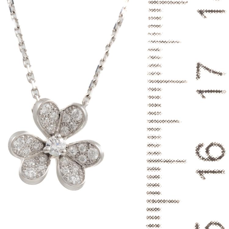 Van Cleef & Arpels Frivole pendant, mini model with 25 round Natural Diamonds totalling 0.21cts. Motif size: 10mm X 11mm. 18ct white gold with 18ct white gold attached chain. Adjustable max length: 40cm. Weight: 3.4g. With Van Cleef & Arpels box and Authenticity Certificate dated 29th August 2021. (Pre-owned)