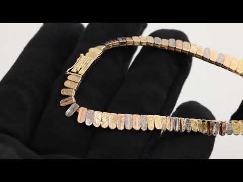 Tri-colour graduated fancy link fringe necklace. 14ct yellow, white and rose gold. Length: 45.5cm. Weight: 41.5g. With Valuation Certificate dated 03/06/22. (Pre-owned)