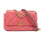 Chanel medium Chanel 19 flap bag in pink, giant diamond quilted lambskin leather. Featuring aged gold & silver hardware, an exterior flat pocket at rear, an gold chain detailed CC turn lock on front flap. It opens to a pink fabric lining interior with a zipper pocket. Approximate dimensions: 25cm(L) x 16cm(H) x 7cm(D), 8.5cm handle height and 50cm shoulder height. Accompanied by a Chanel dustbag, Chanel certificate card. With Entrupy Certificate of Authenticity. (Pre-owned)
