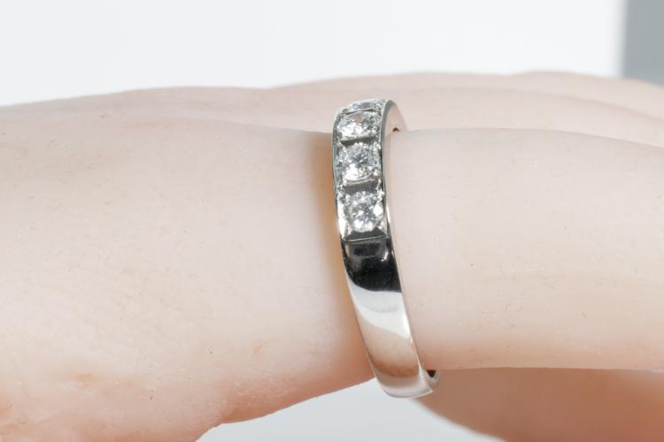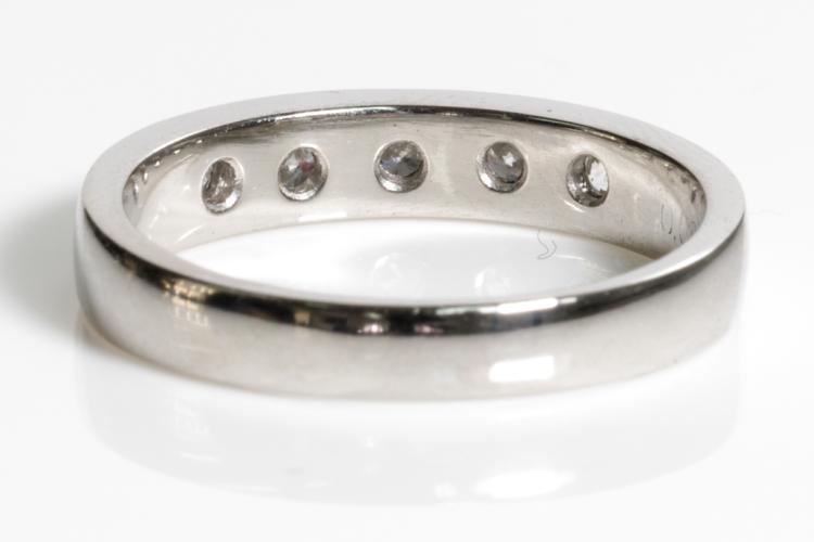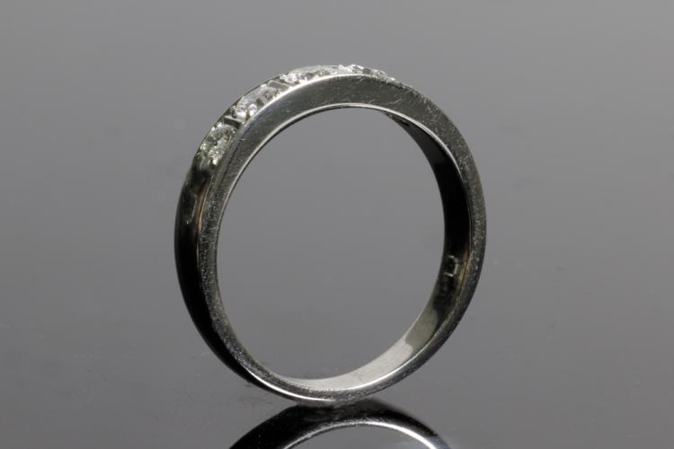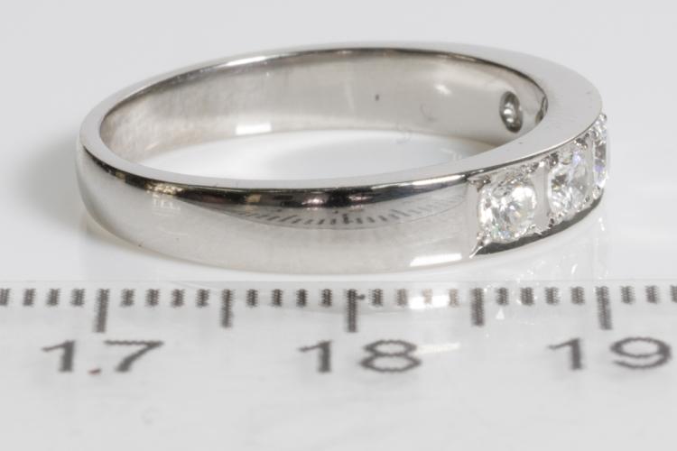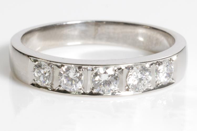 Diamond eternity ring with 5 round Diamonds totalling 0.59cts (Estimated grading: G-H SI). Platinum - 900. Ring size Q1/2 - ring resizing is not recommended. Weight: 6.9g. (Pre-owned)