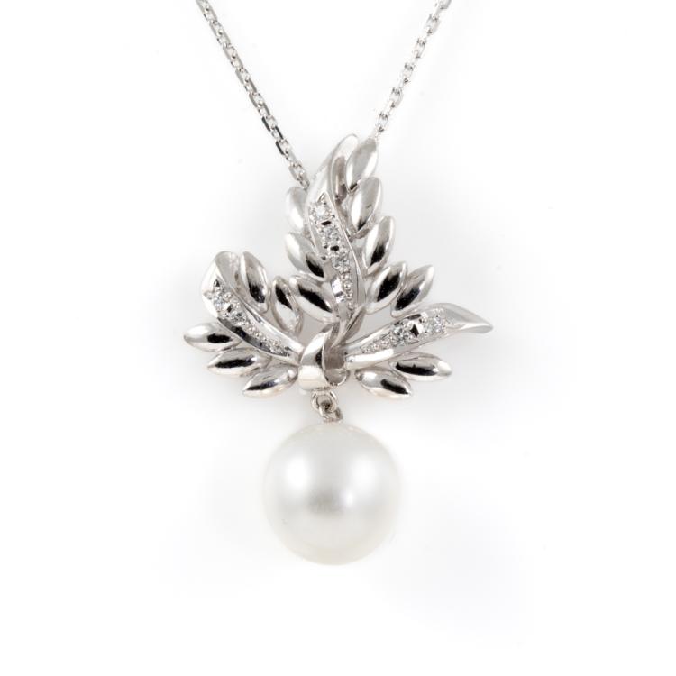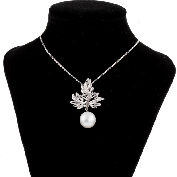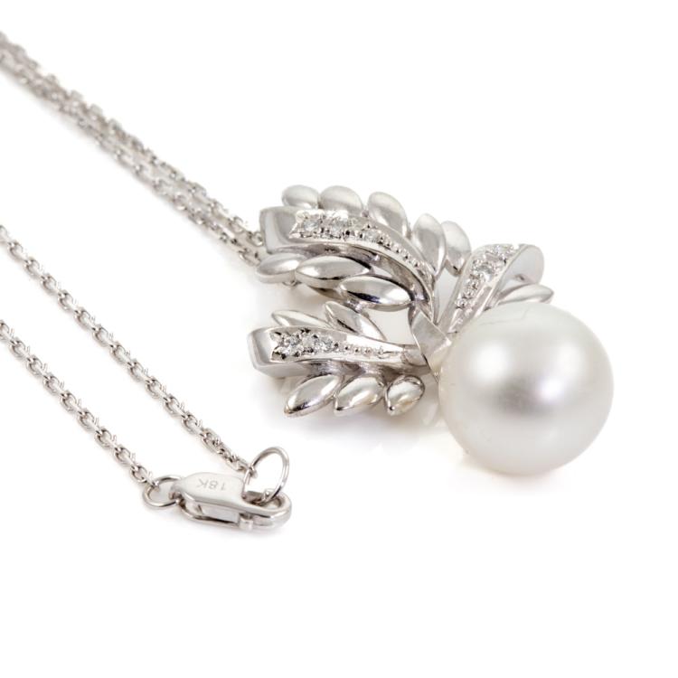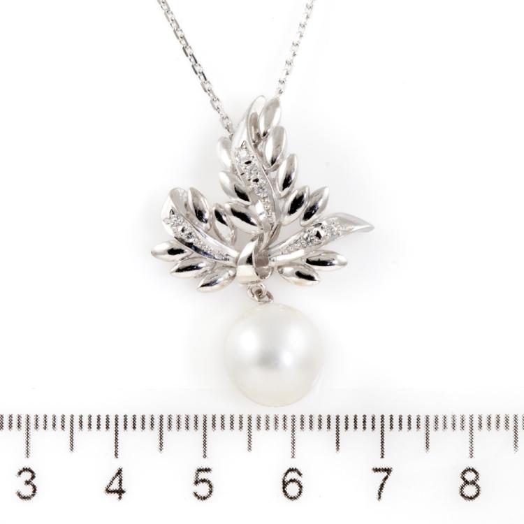Pearl and Diamond pendant with South Sea Pearl of 11.3mm and Diamonds totalling 0.09cts. Platinum -900 with 18ct white gold 46cm chain. Weight: 10.9g. (Pre-owned)