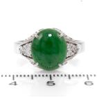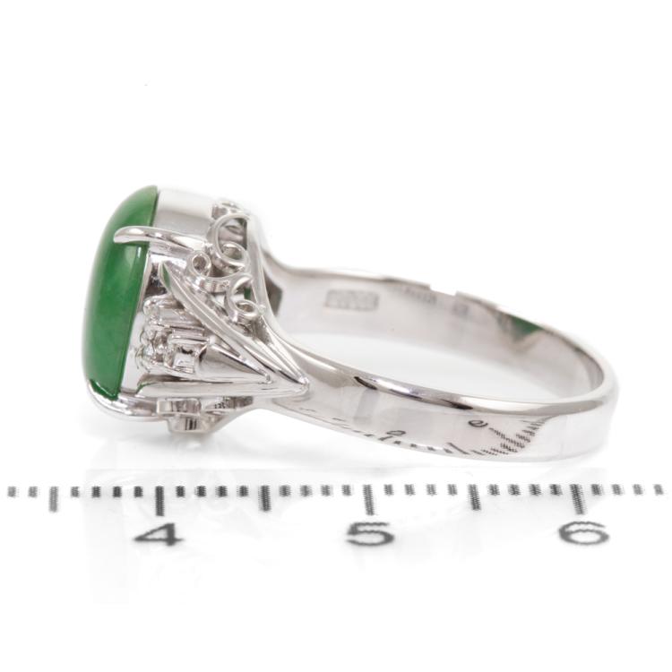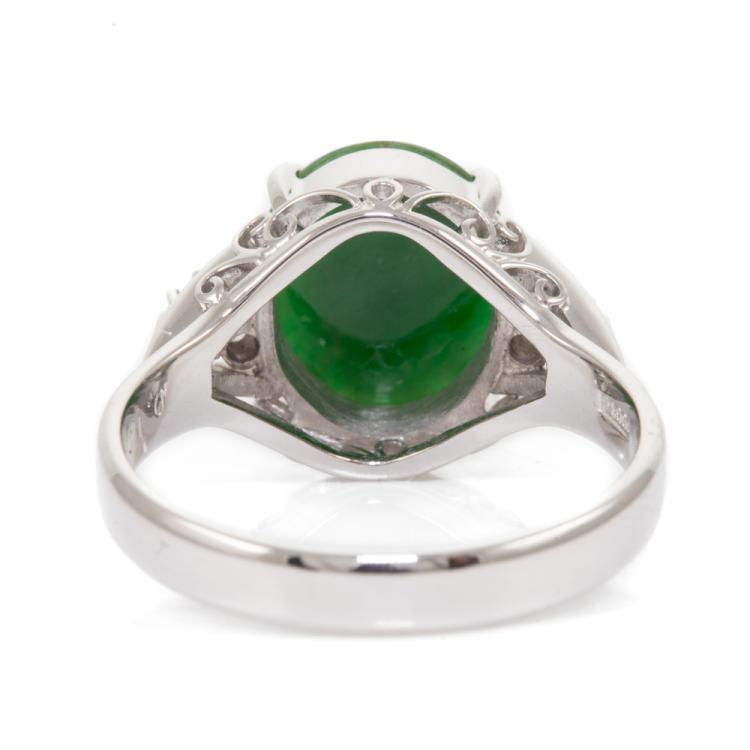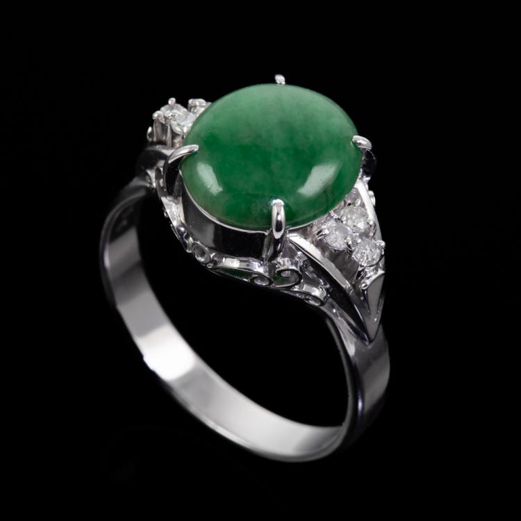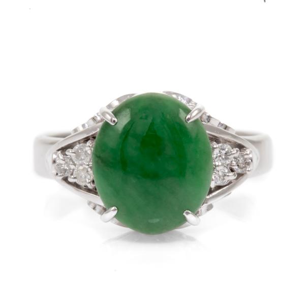 Jade and Diamond ring with oval cabochon cut green Natural Jadeite Jade - Type A of approximately 2.80cts and round Natural Diamonds totalling 0.10cts. Platinum 900. Ring size N. Band width:3.2mm. Weight: 7.2g. (Pre-owned)
