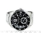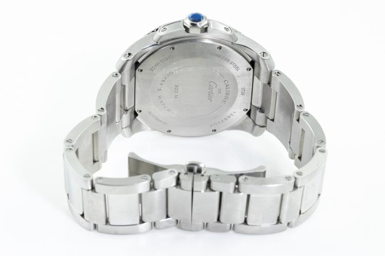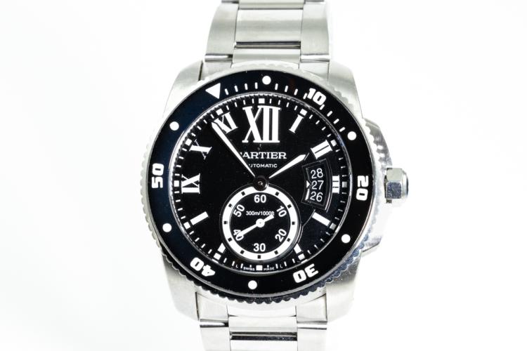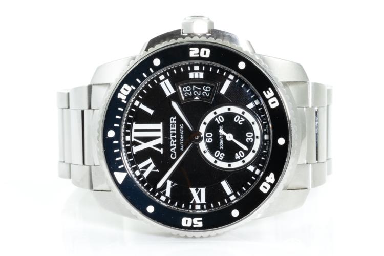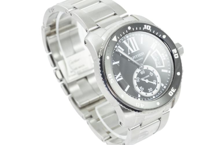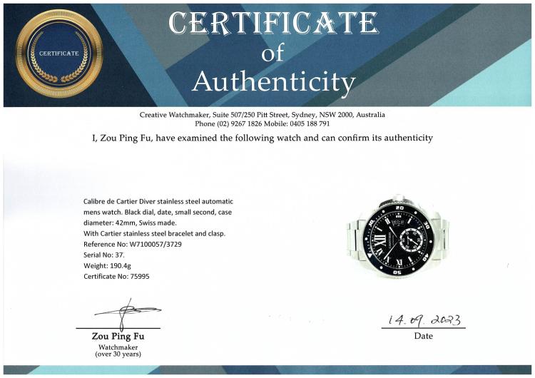 Calibre de Cartier Diver stainless steel automatic mens watch. Black dial, date, small second, case diameter: 42mm, wrist size: 19cm, Swiss made. Ref# W7100057/3729. With Cartier stainless steel bracelet and clasp. With Certificate of Authenticity, Cartier Certificate of Guarantee Booklet dated 15/04/2015 and Cartier box. 3 month FSA warranty. (Pre-owned)