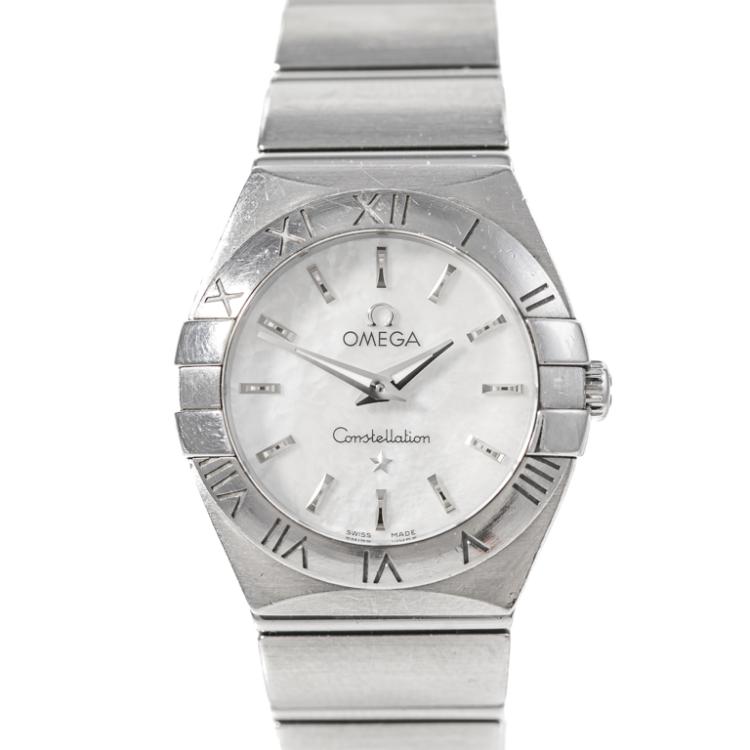 Omega Constellation stainless steel quartz ladies watch. Mother of Pearl dial, case diameter 24mm, wrist size 15cm, Swiss made. Ref# 123.10.24.60.05.001. With Omega stainless steel bracelet and clasp. With Certificate of Authenticity and Undated Omega International Warranty card and Pictograms card. No Warranty applies. (Pre-owned)