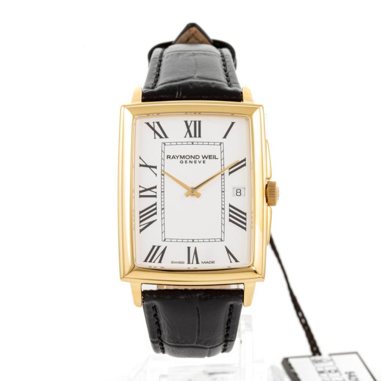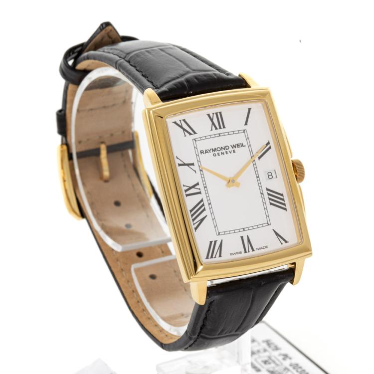 Raymond Weil Toccata Yellow gold PVD plating and stainless steel quartz mens watch. White dial, date, case diameter: 37mm x 29mm, Swiss made. Ref# 5425-PC-00300. With Raymond Weil black leather strap and buckle. With Raymond Weil Guarantee card and Raymond Weil box. 12 month FSA warranty (AS new, Note: minor scuff of case and minor light wear on strap due to being stock display)