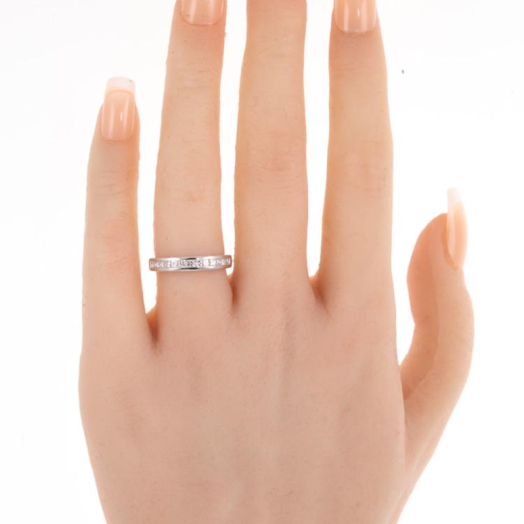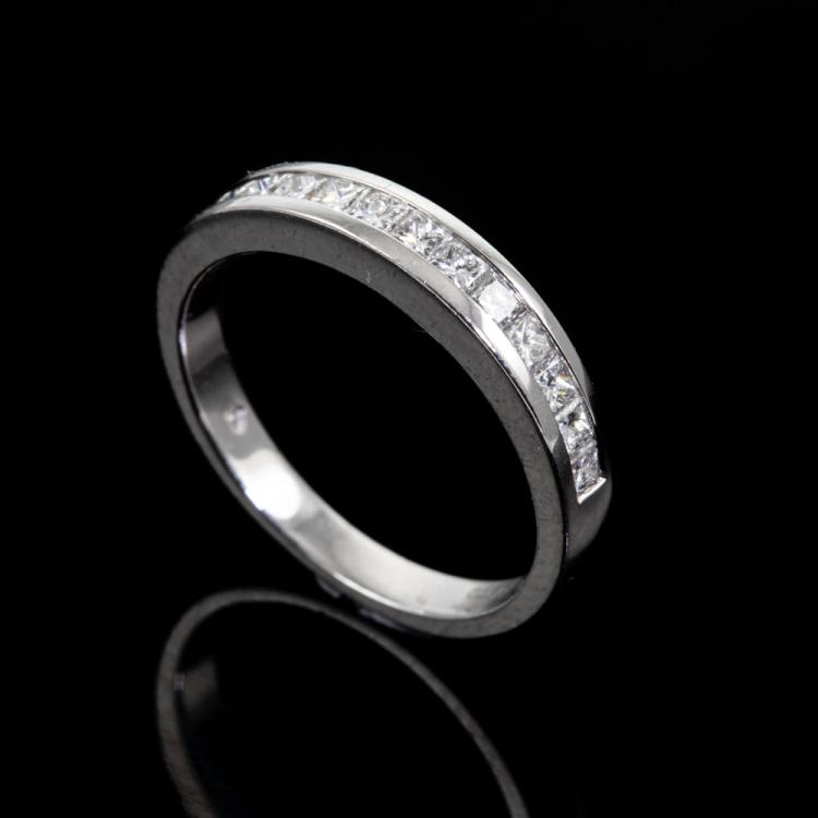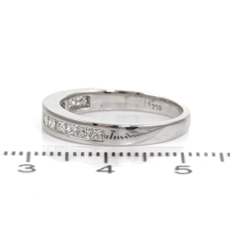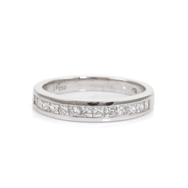 Diamond half loop eternity ring with princess cut Natural Diamonds totalling 0.50cts (Estimated grading: H-I SI). 18ct white gold. Ring size: L. Band width: 2.8mm - 2.6mm. Weight: 3.7g. (As New)