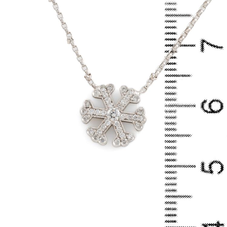 Snowflake design pendant with round Natural Diamonds totalling 0.20cts. Size 11mm. 18ct white gold with attached 18ct white gold adjustable chain. Length: 50cm. Weight: 3.7g. (As new)