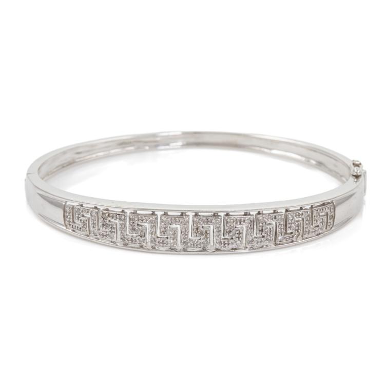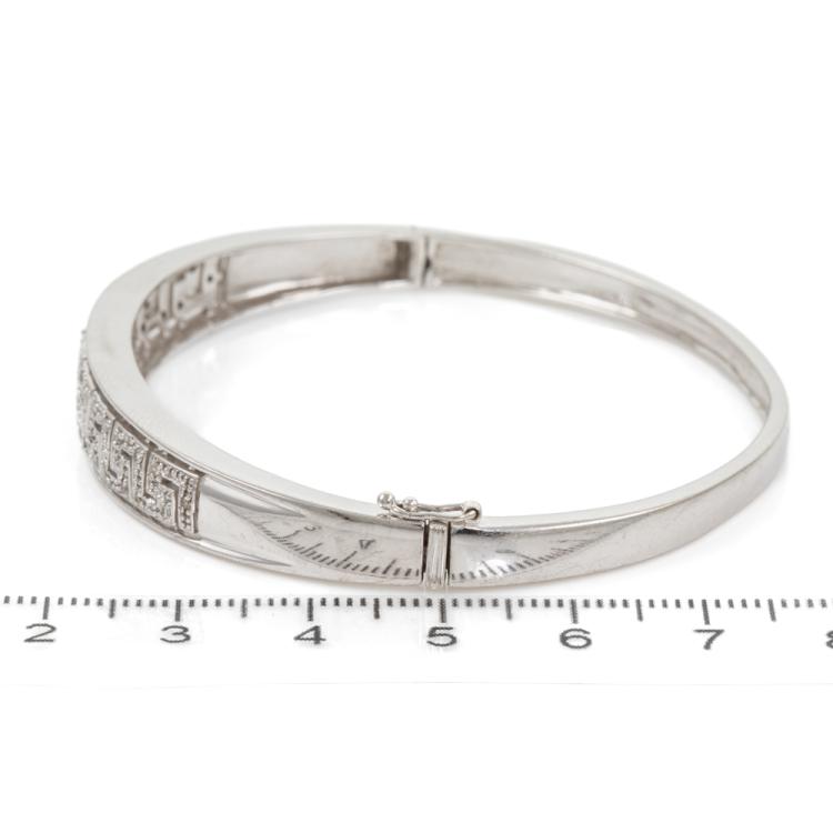 Diamond hinged bangle with round natural Diamonds totalling 0.25ct. 9ct white gold. Circumference: 17.5cm. Width: 3.6mm-8.9m. Weight: 16.7g. (Pre-owned)